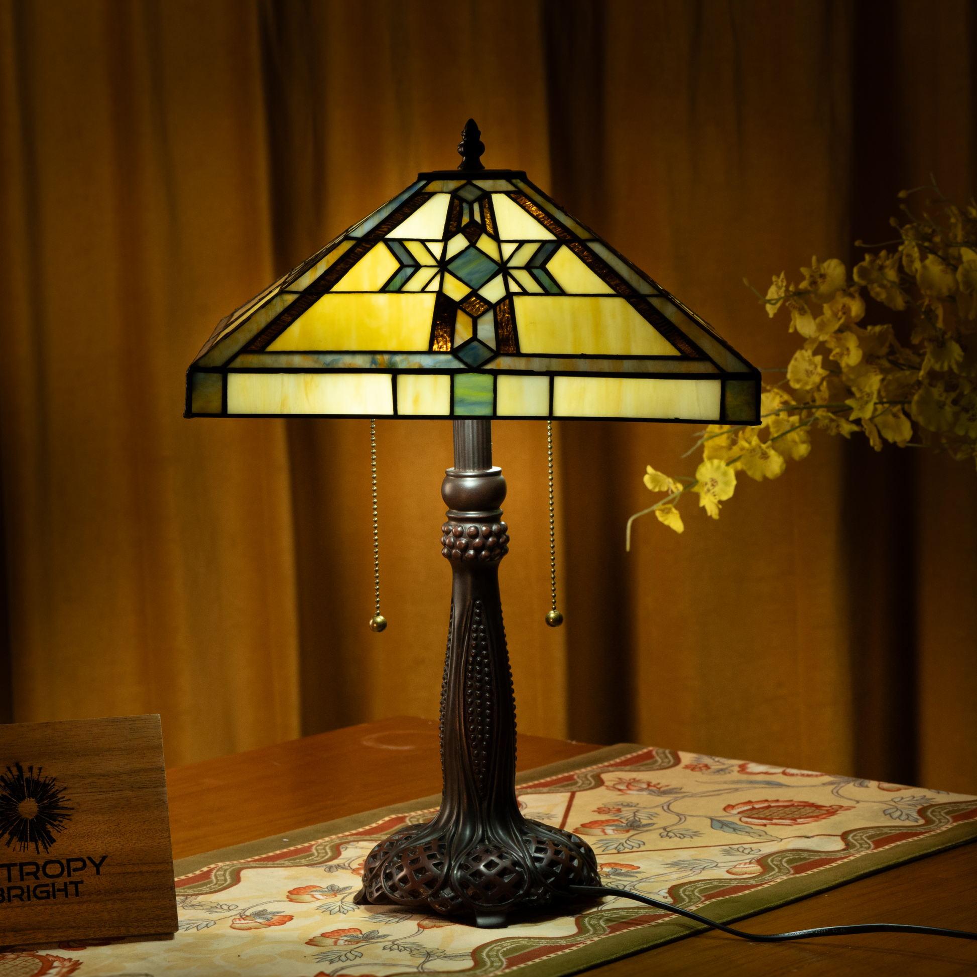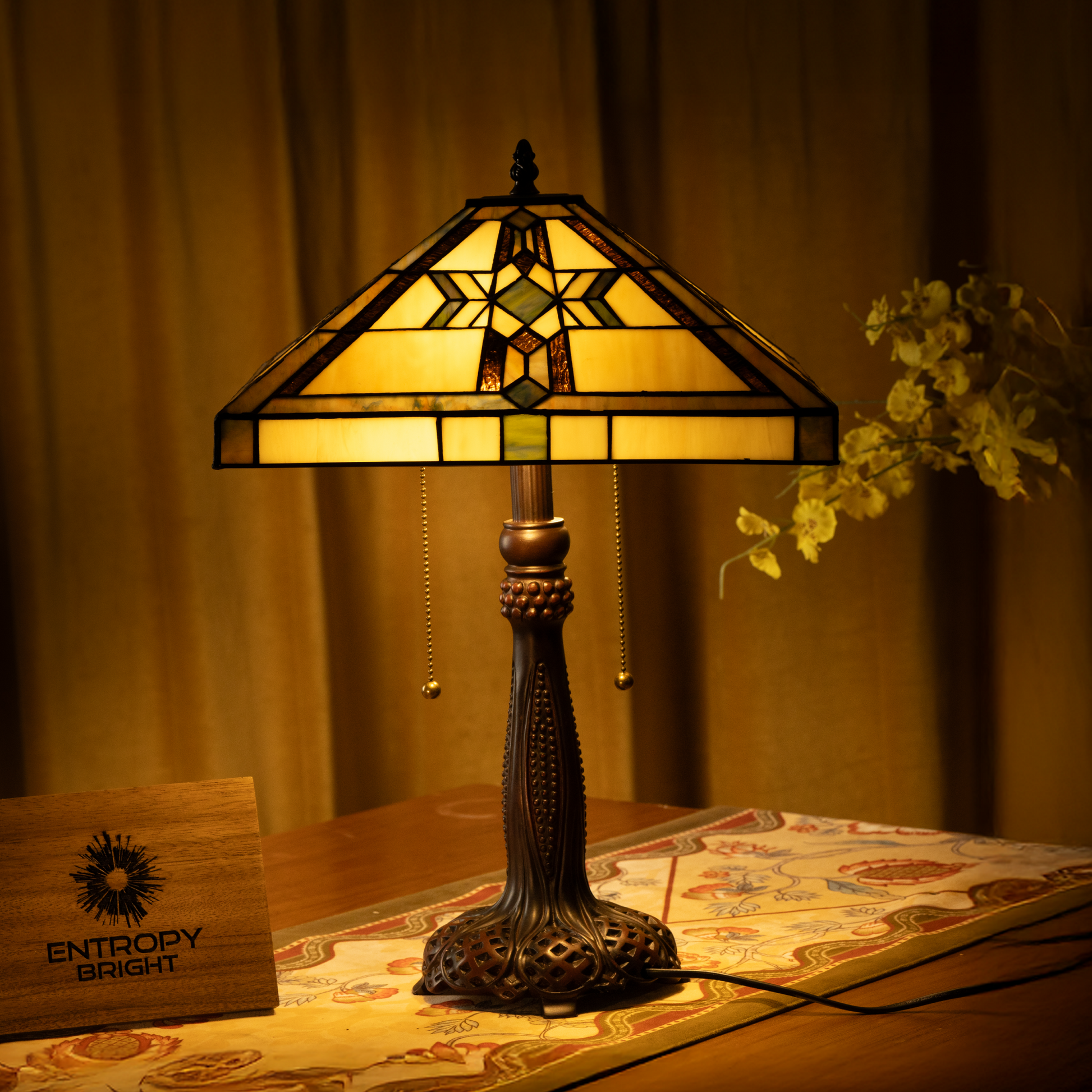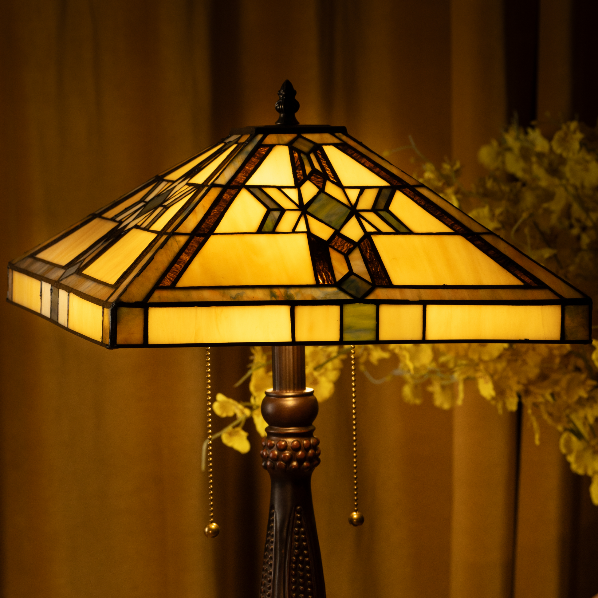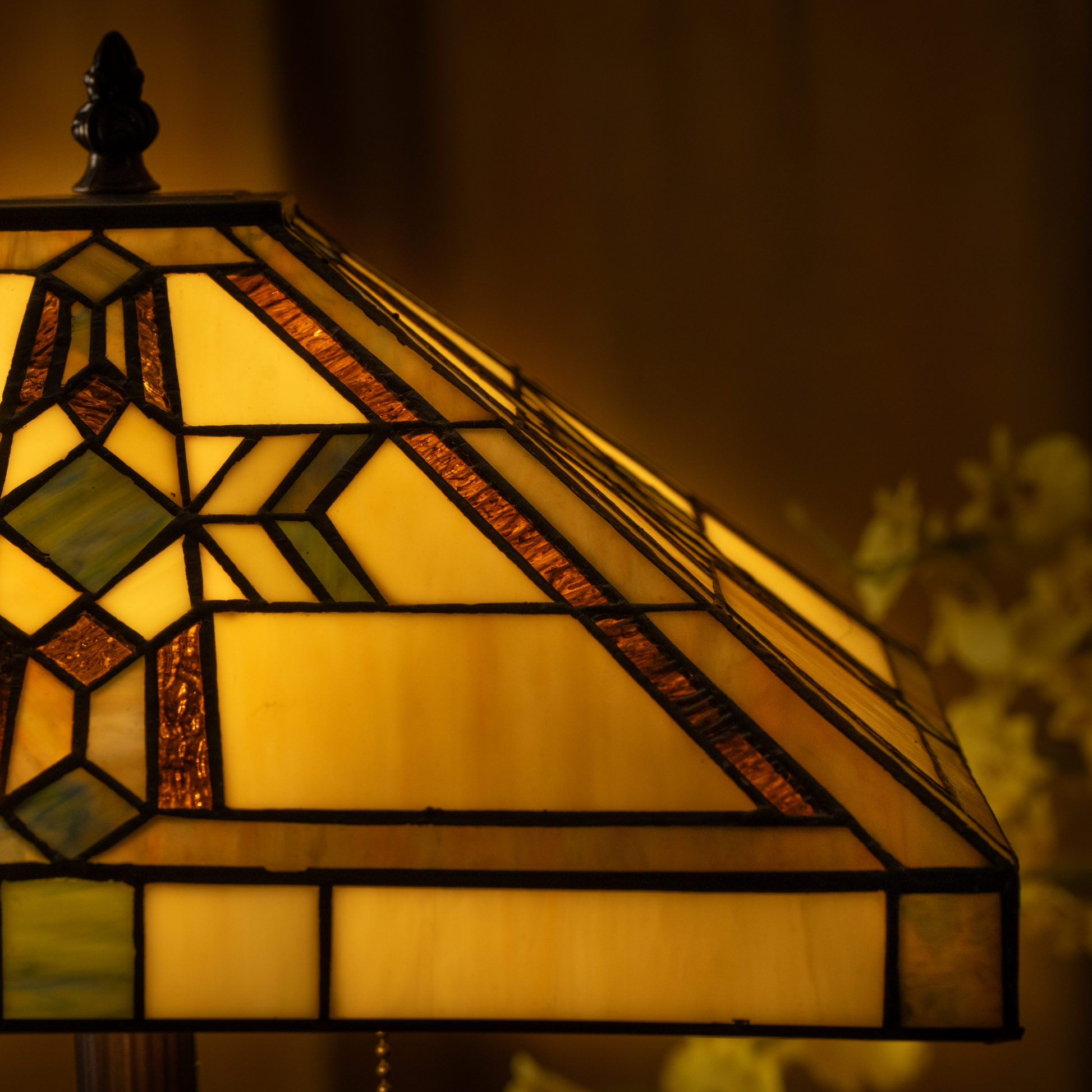 Crafted with precision, the stained glass shade features starburst and symmetrical motifs in rich amber hues. Its structured design brings a sense of balance and refined artistry to any room.