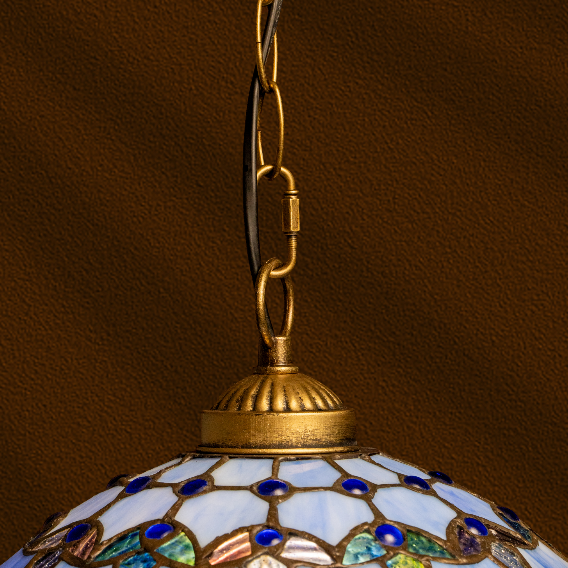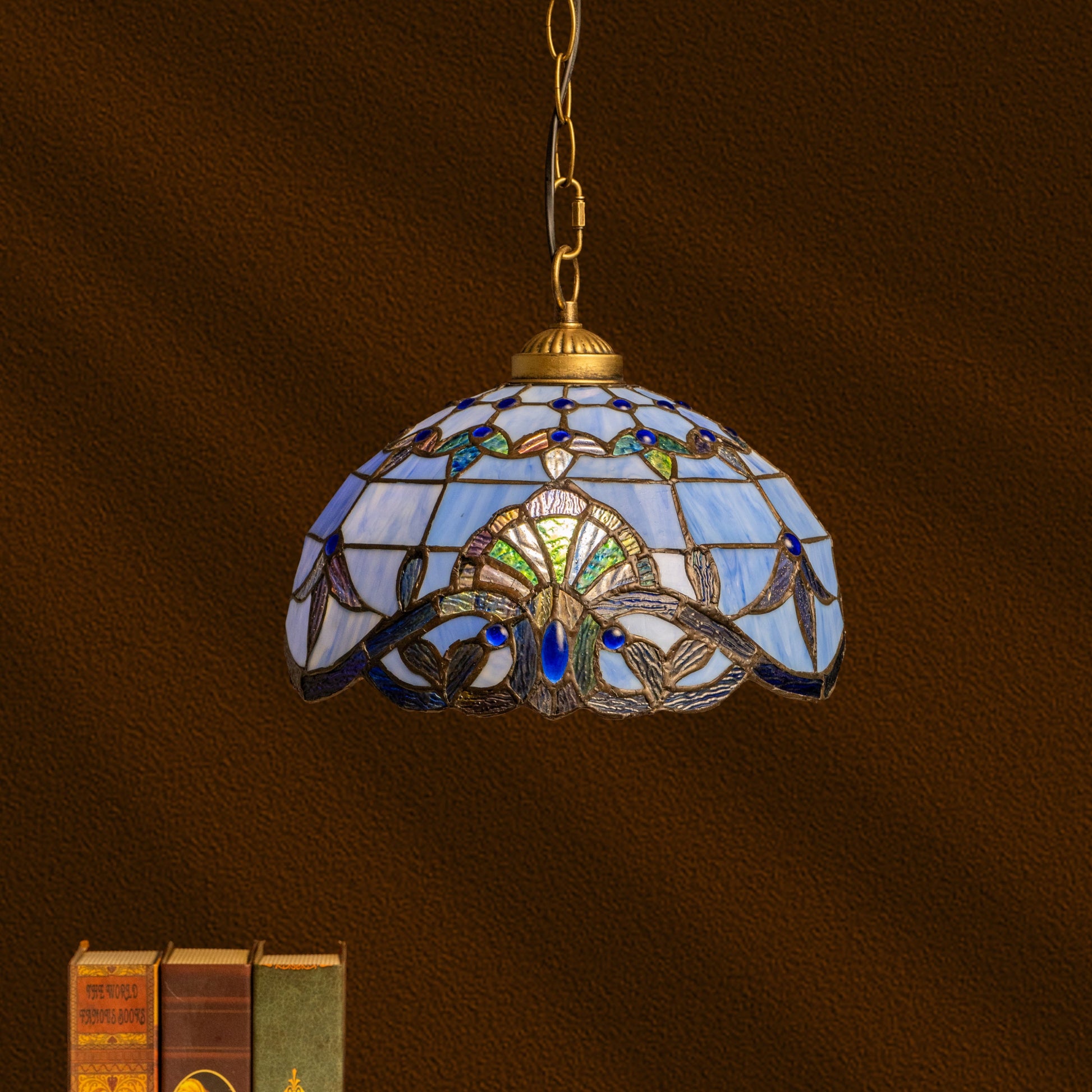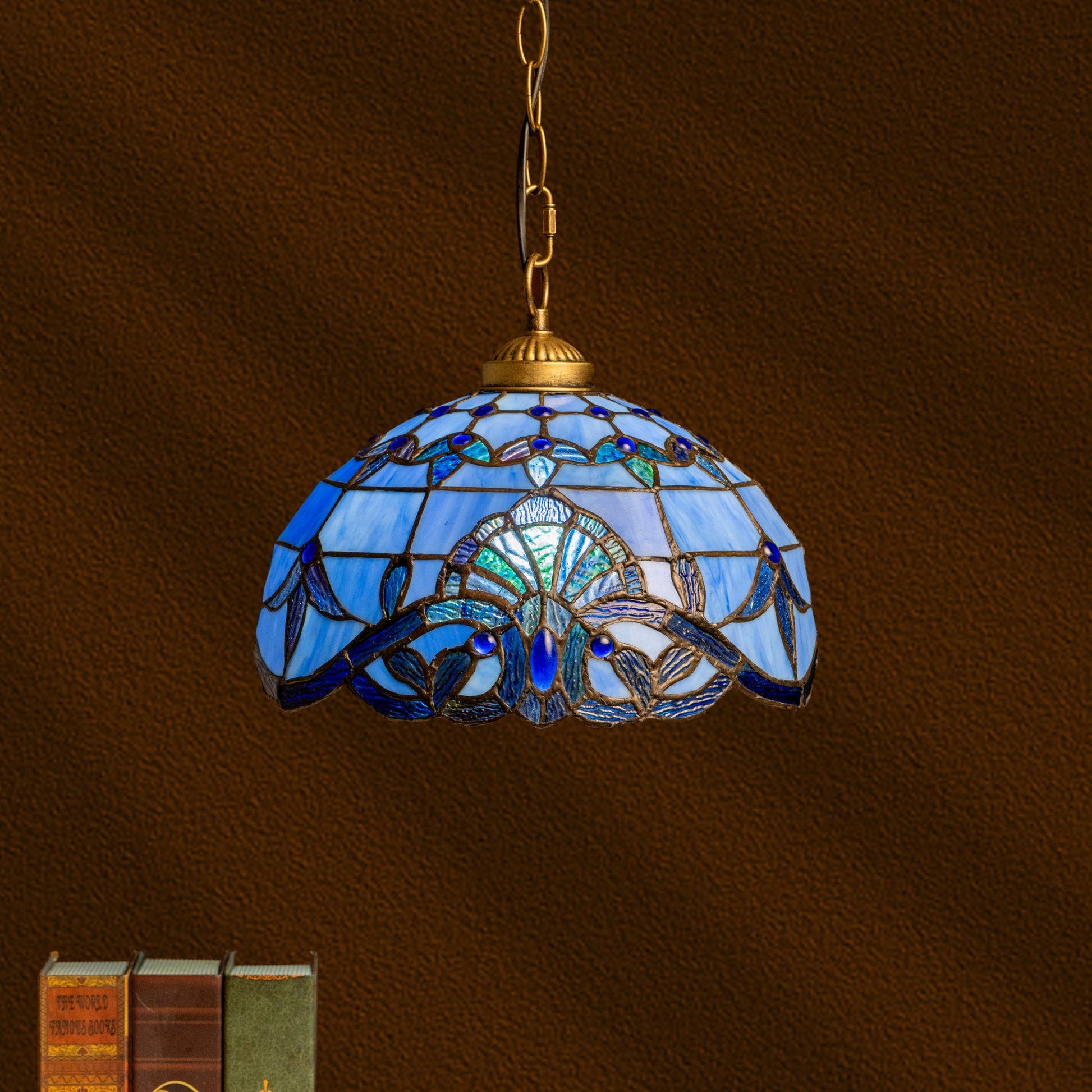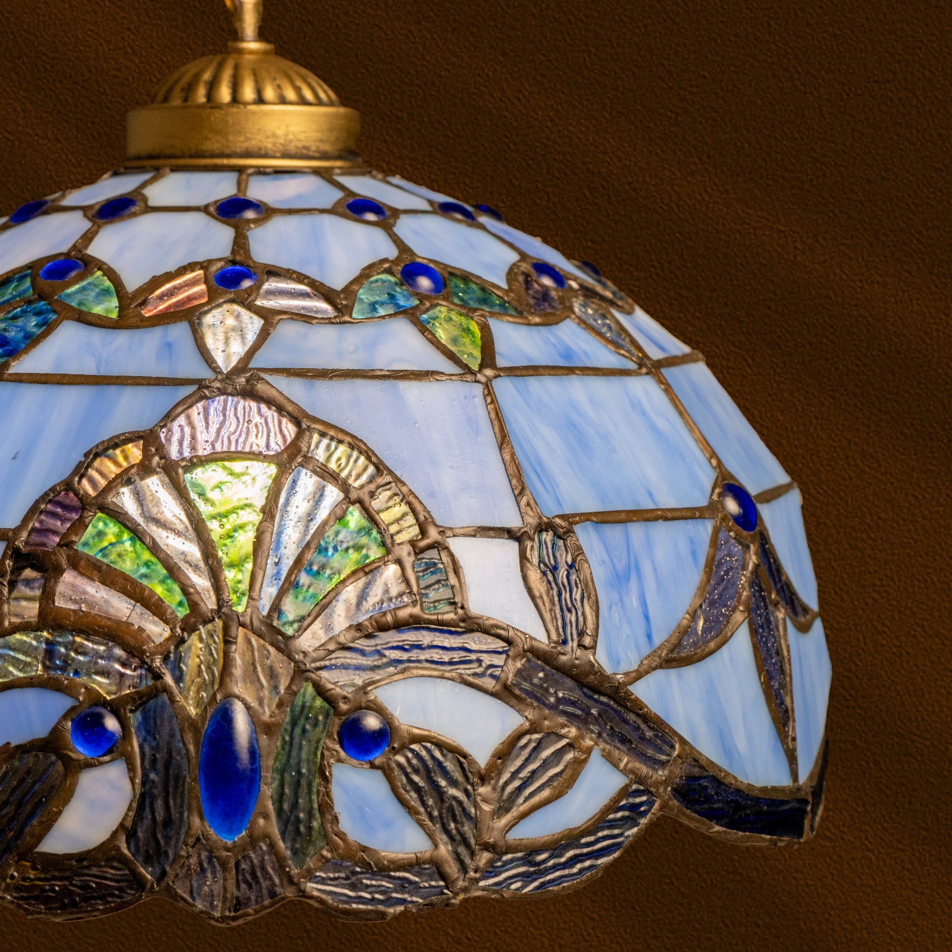 The Azure Elegance Tiffany Pendant showcases a harmonious blend of soft and rich blue stained glass, complemented by delicate scrollwork and jewel-like accents. Its tranquil color palette captures the calm beauty of a clear sky, bringing a sense of peace to any setting.