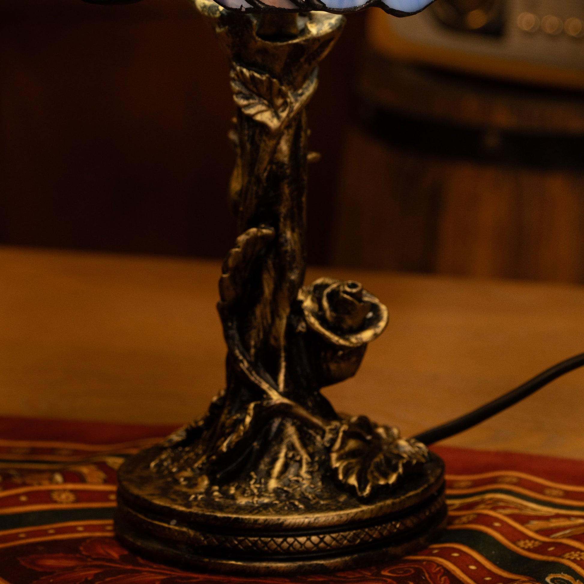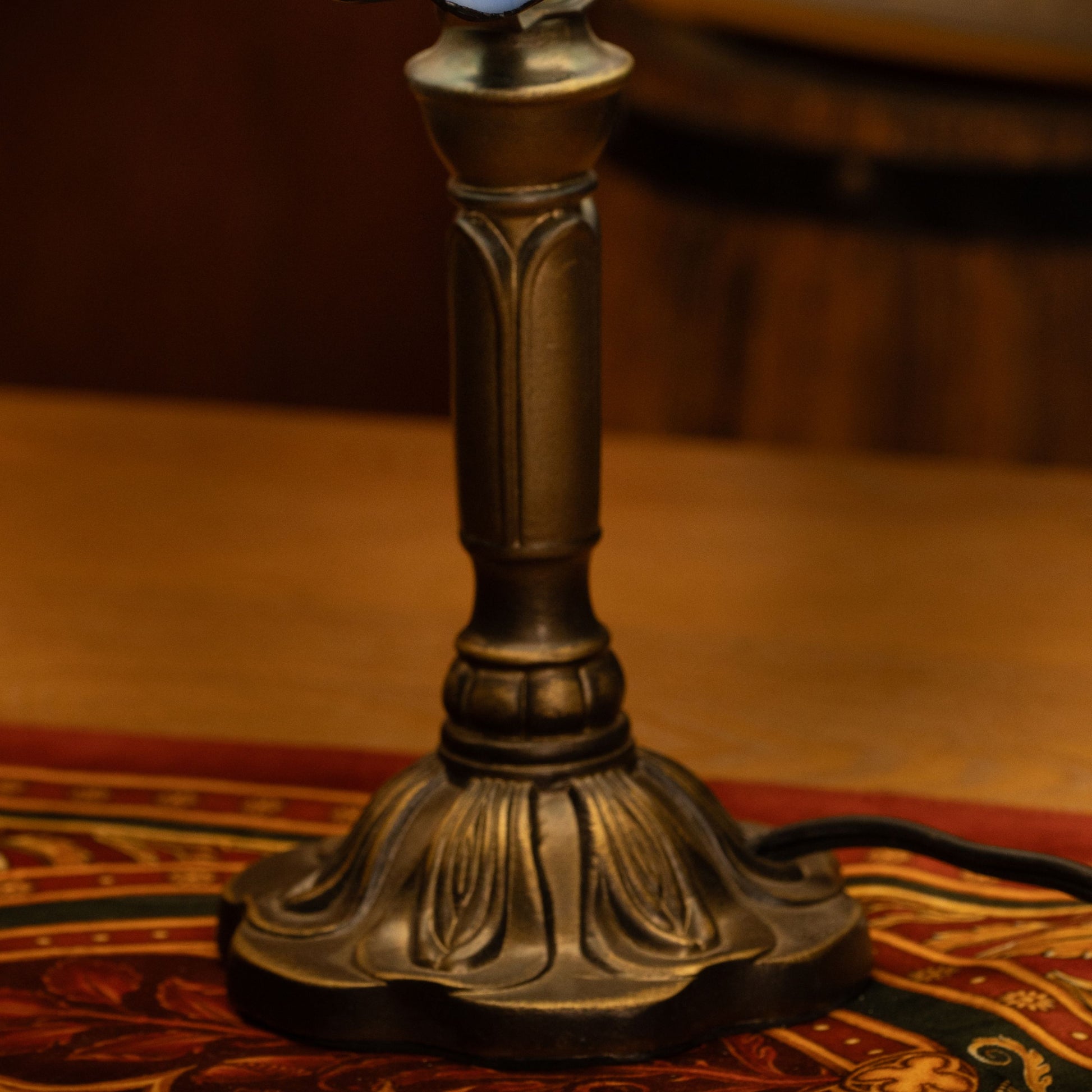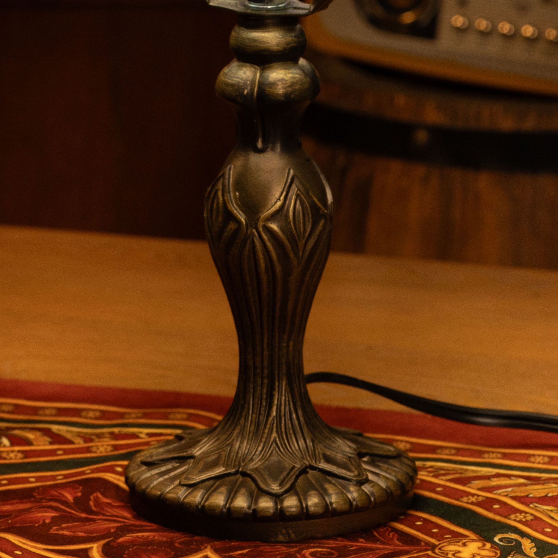 Material: Handcrafted Stained Glass Shade, Metal Base with Antique Bronze Finish