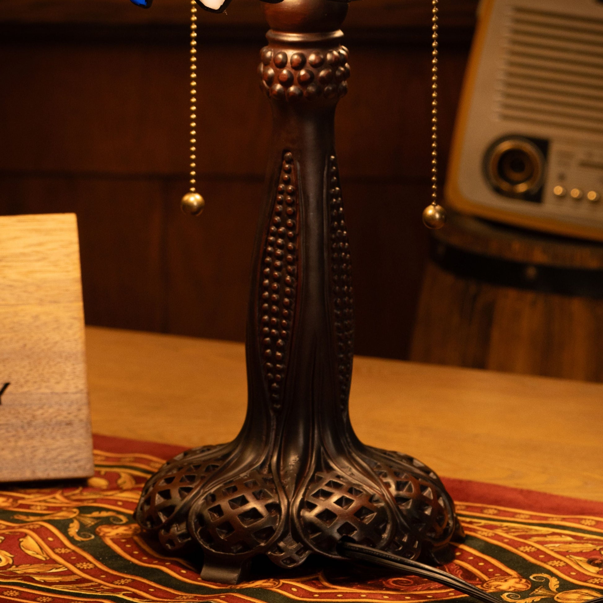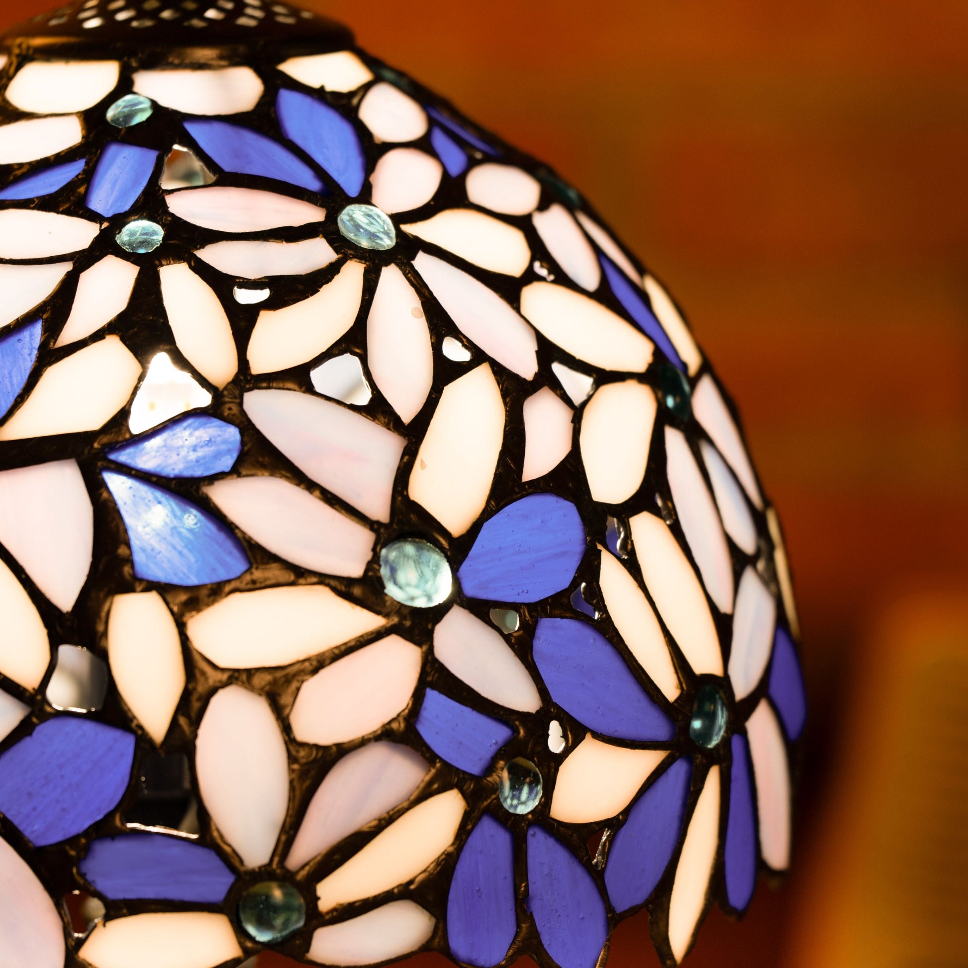 Material: Handcrafted Stained Glass Shade, Metal Base with Antique Bronze Finish