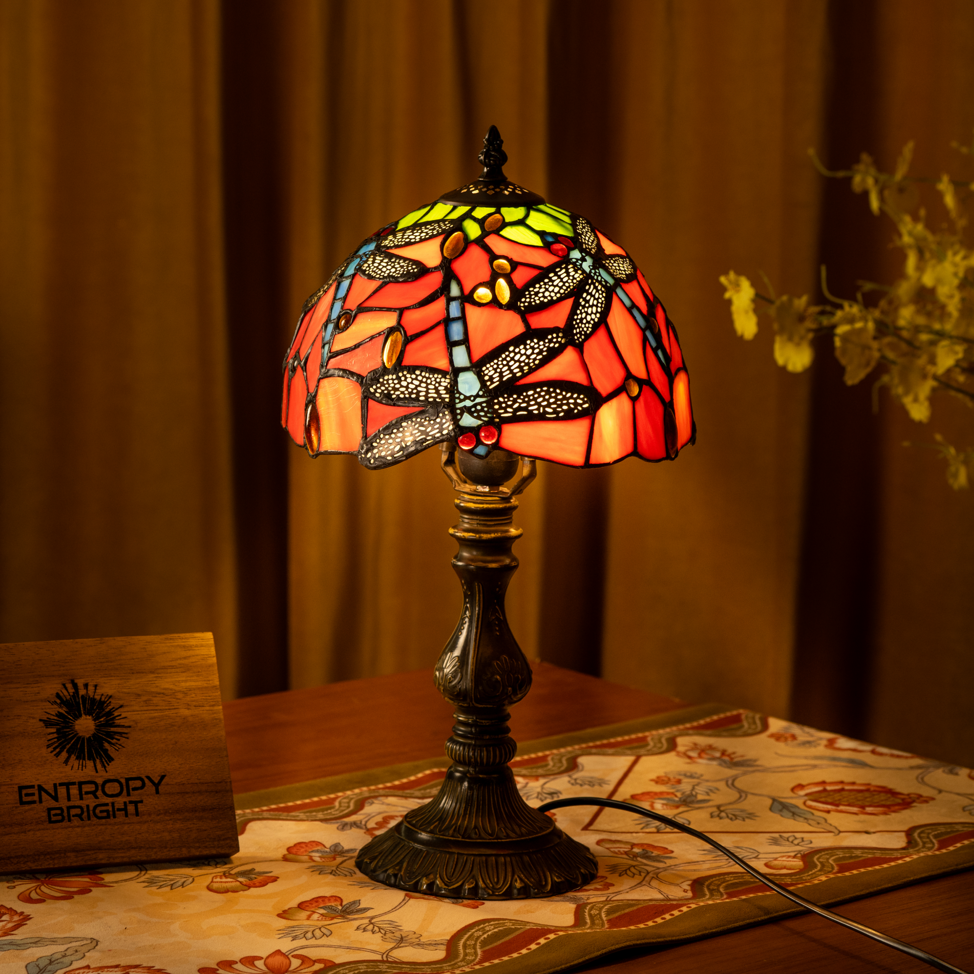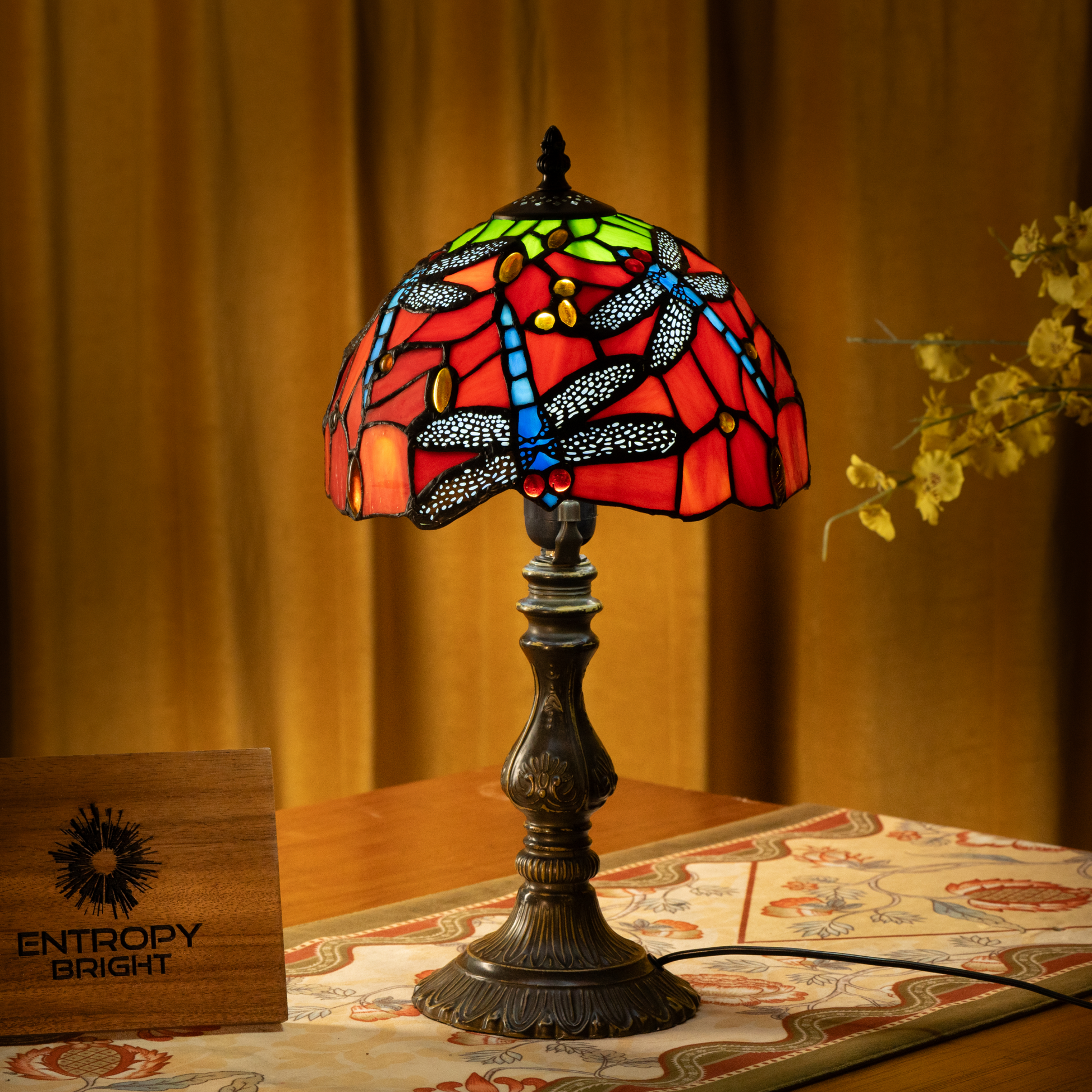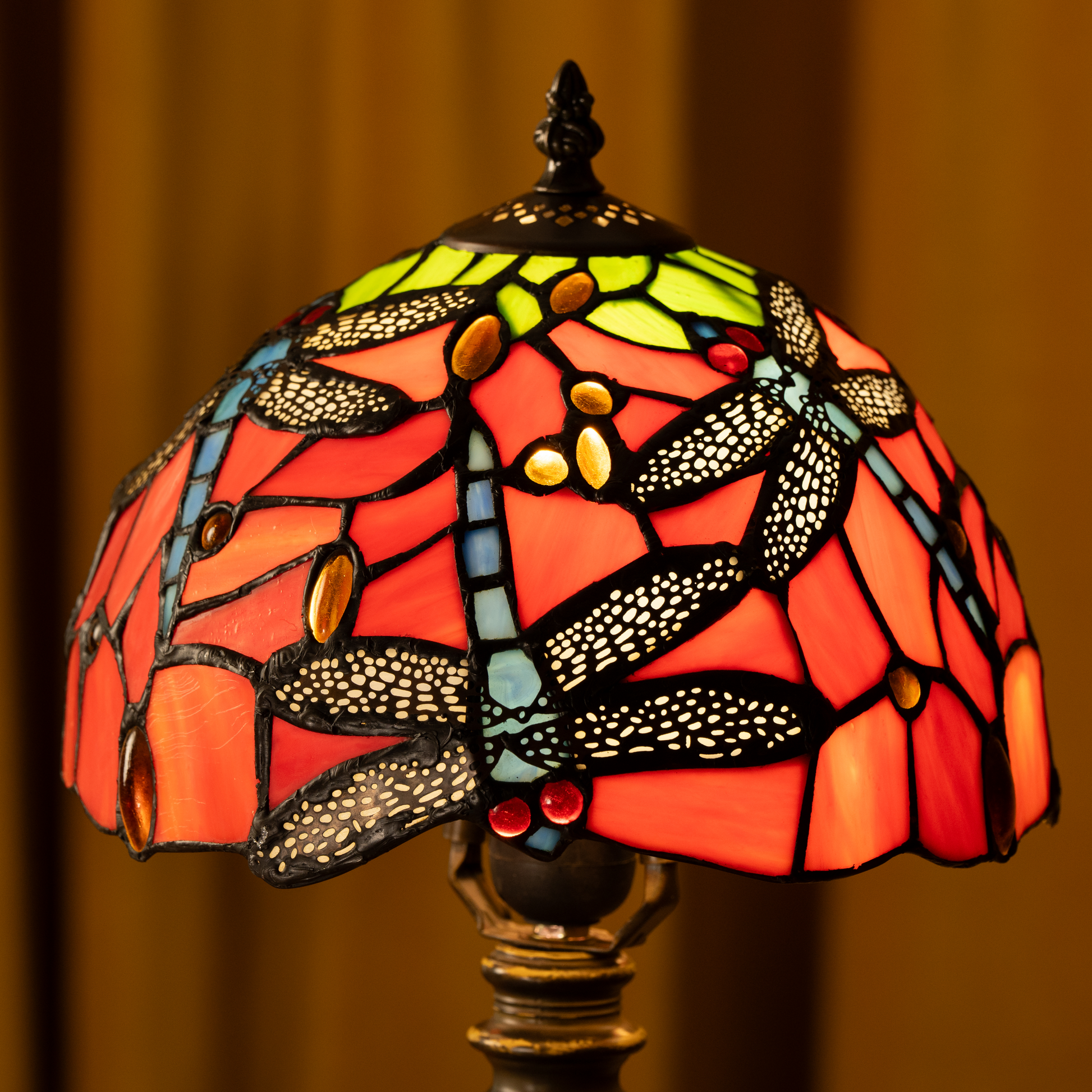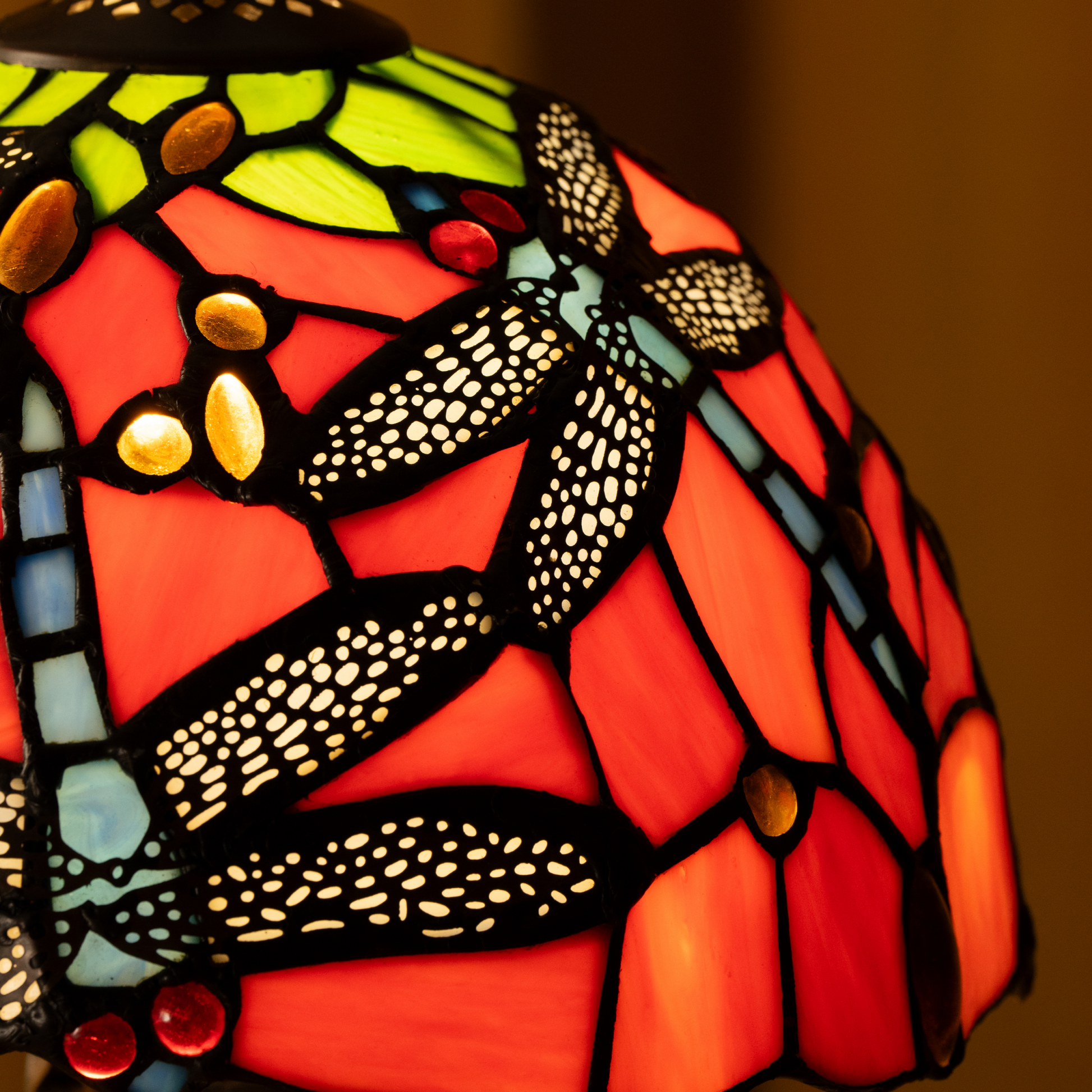 Featuring a deep crimson stained glass shade with delicate dragonfly motifs, this lamp captures the romanticism of early 20th-century design. Blue and amber details offer layered contrast, creating a richly textured and visually captivating effect.