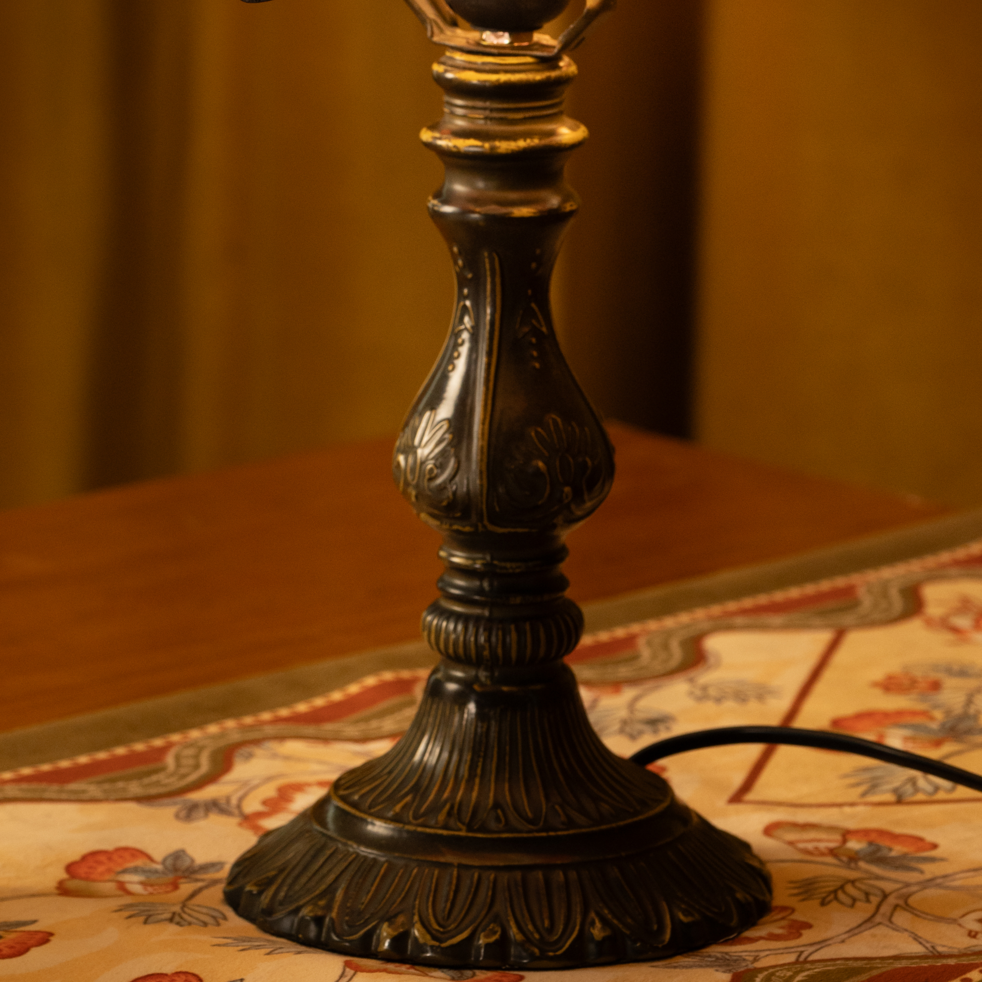 The bronze-toned base complements the vibrant glasswork, reinforcing the piece’s vintage appeal. Ideal for bedrooms, reading nooks, or art-filled interiors seeking a distinctive accent.