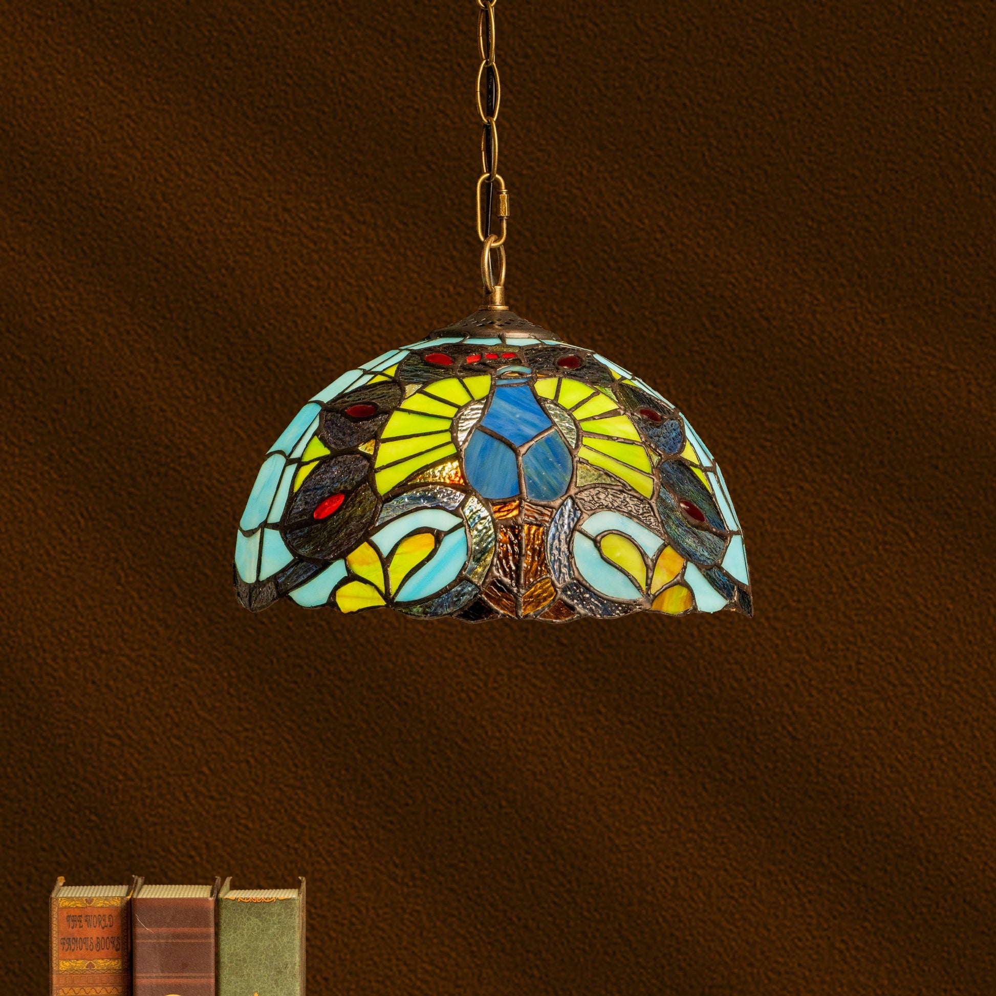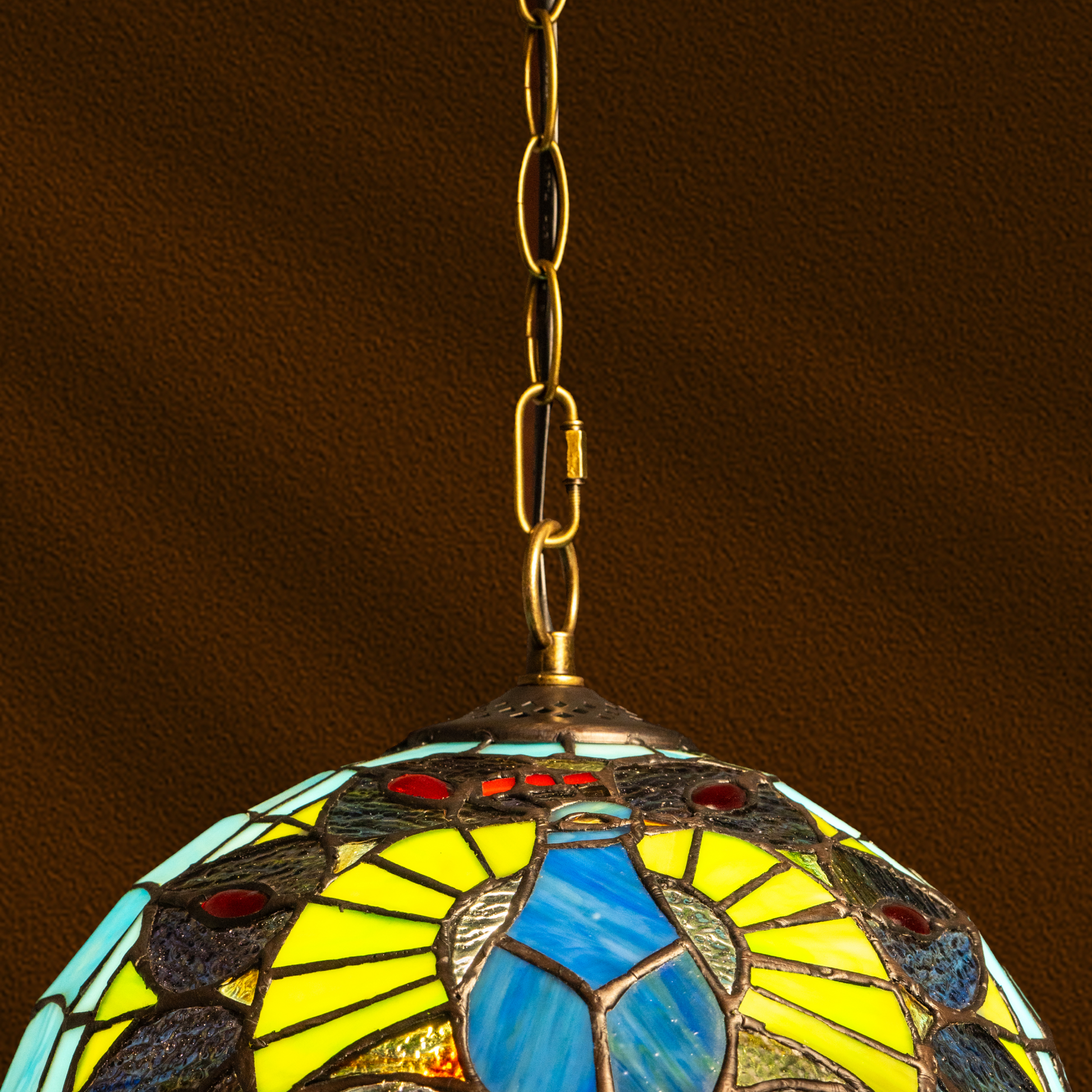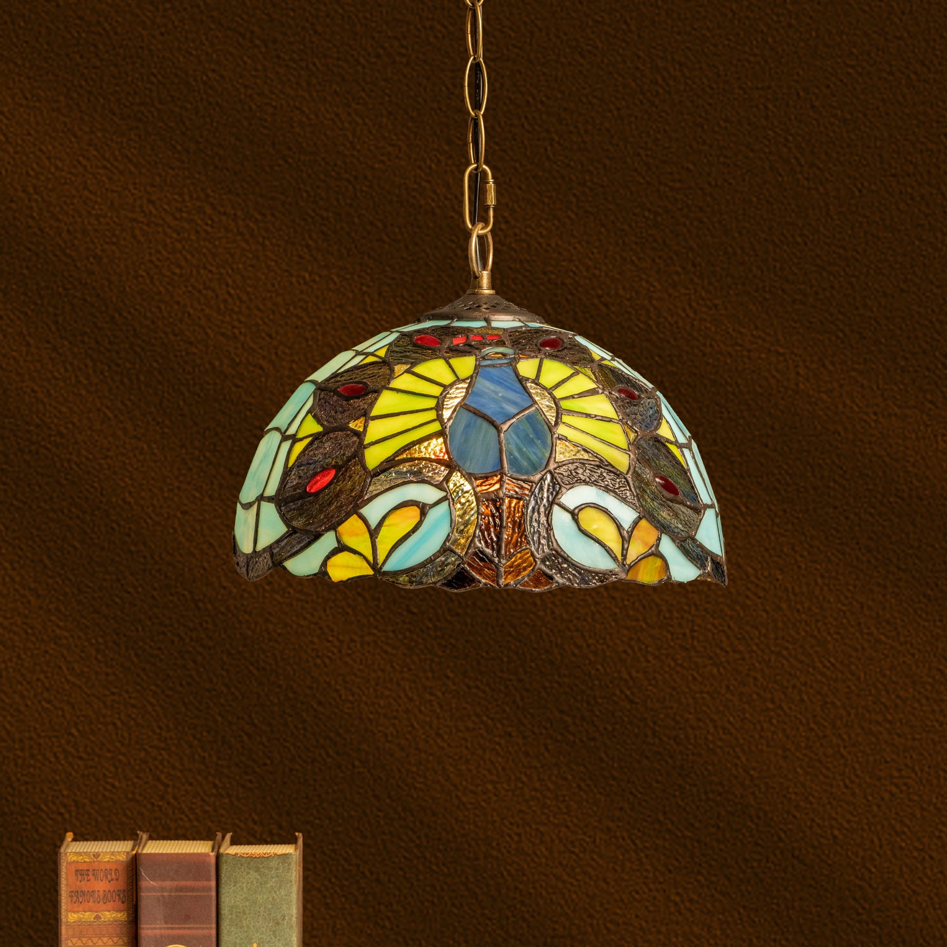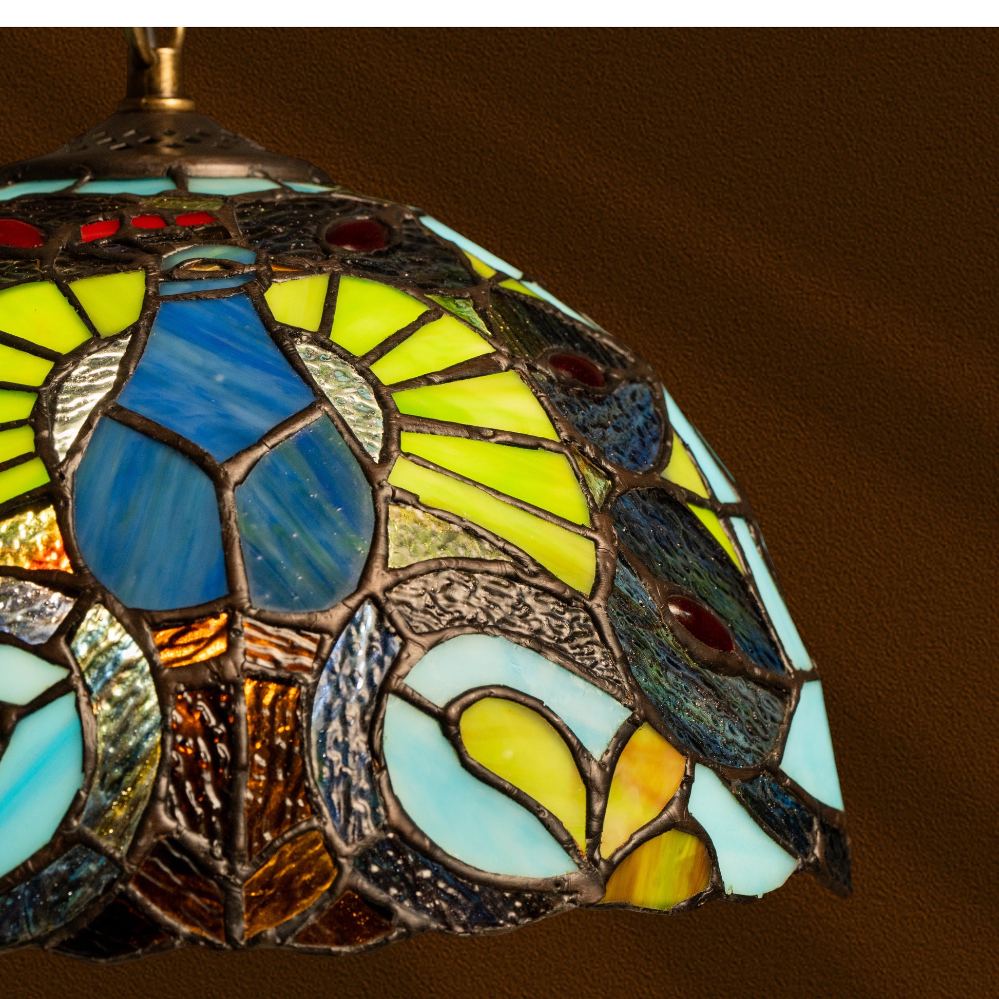The Enchanted Forest Tiffany Pendant brings the tranquility of nature indoors with a harmonious blend of earthy greens, sky blues, and golden ambers. Red glass jewels and delicate leaf motifs add dimension and artistry to this handcrafted stained glass piece.