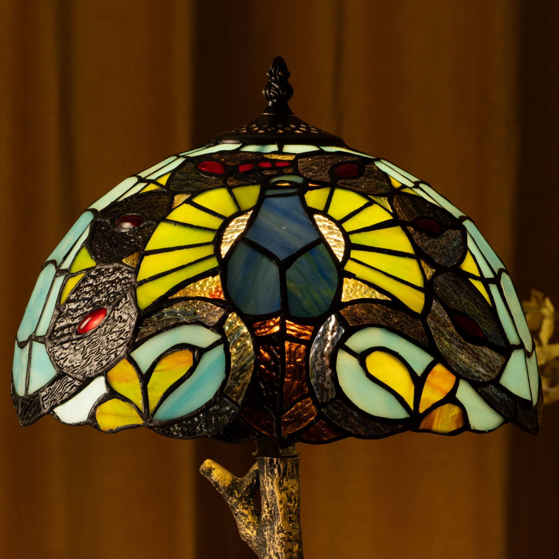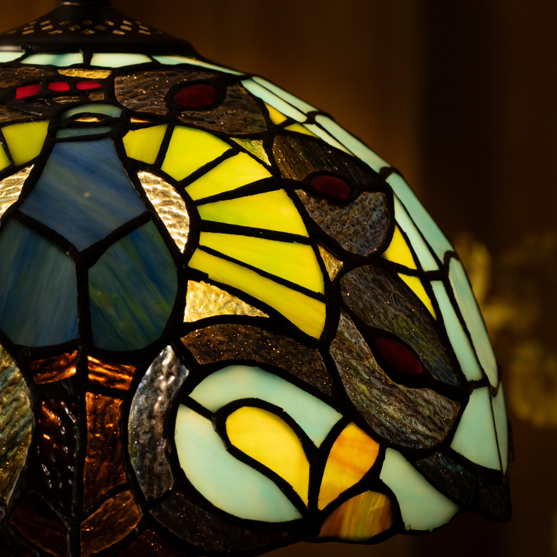 With a vibrant blend of green, blue, and earth-toned stained glass, the shade evokes the tranquility and richness of a woodland canopy. Delicate leaf motifs and jewel-like accents add sparkle and dimension, transforming light into a natural spectacle.