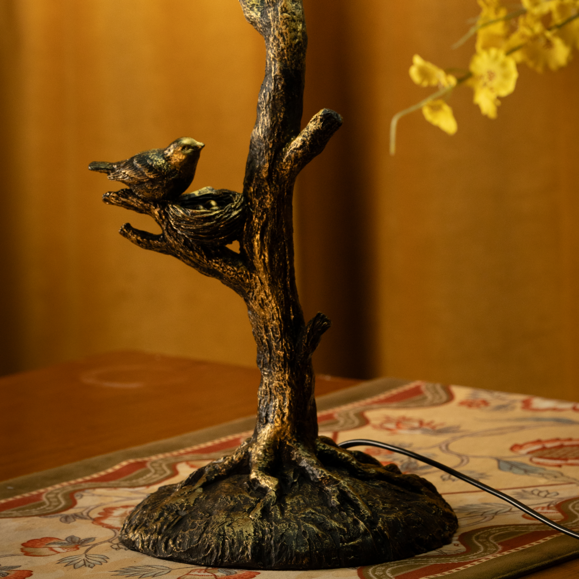 The intricately designed base mimics a textured tree trunk, complete with a perched bird that adds personality and charm. A seamless fusion of art and nature, ideal for rustic interiors, nature-themed corners, or serene reading spaces.