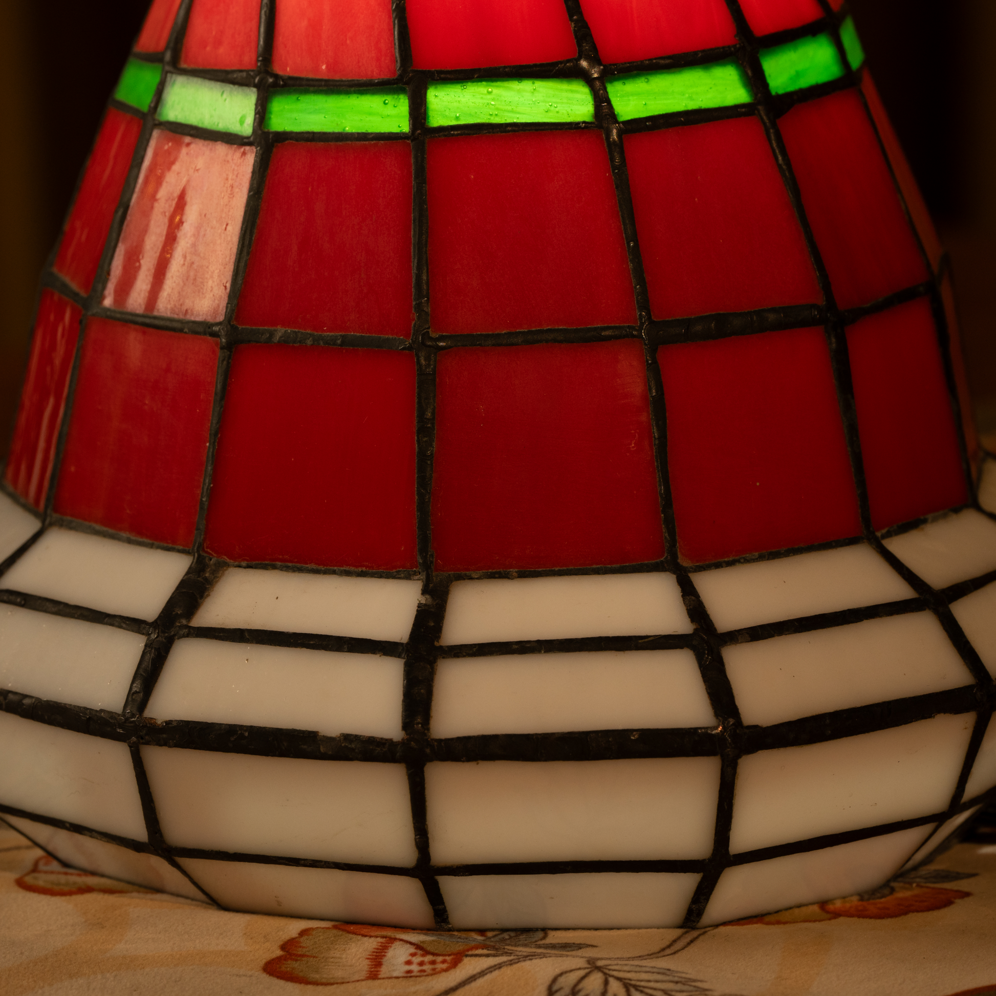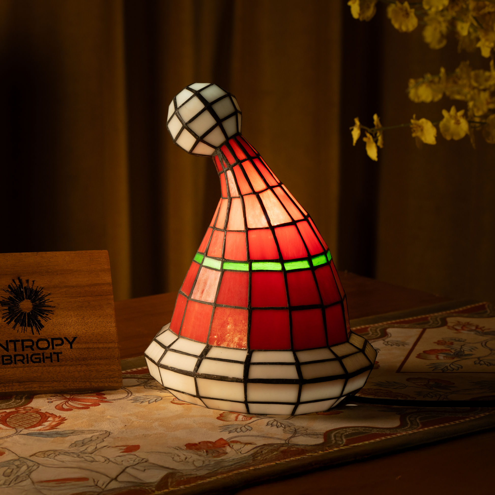This charming Tiffany lamp takes the form of a classic Santa hat, crafted from vibrant red and white stained glass with a cheerful green stripe. A playful addition that instantly lifts spirits and brings a touch of yuletide magic to any corner.