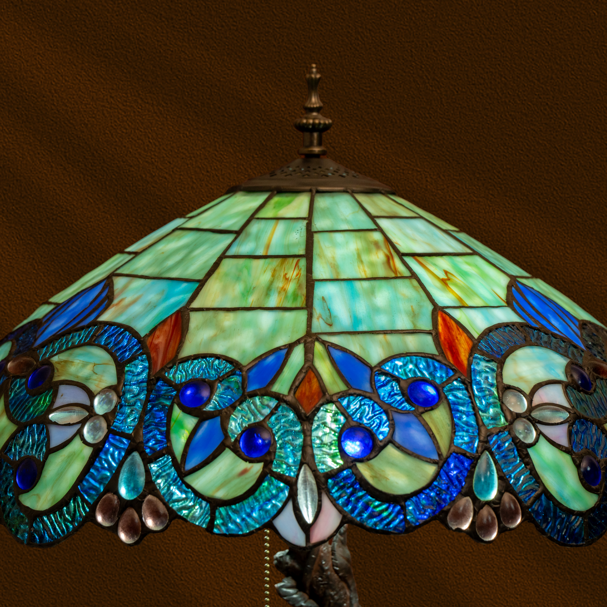Each shade is assembled by hand using traditional copper foil techniques. Individually cut glass pieces form intricate floral and geometric motifs, celebrating the heritage of authentic Tiffany artistry.
