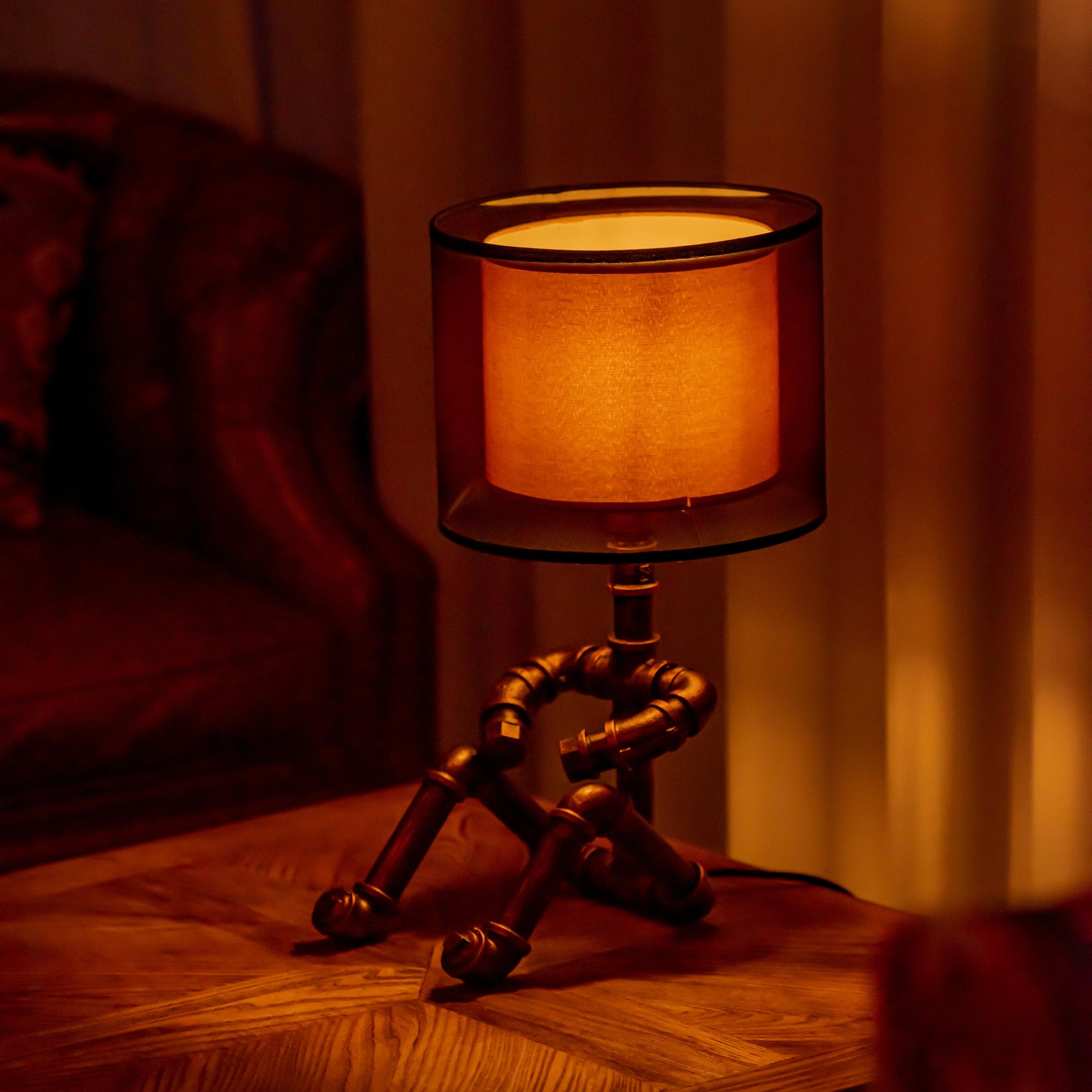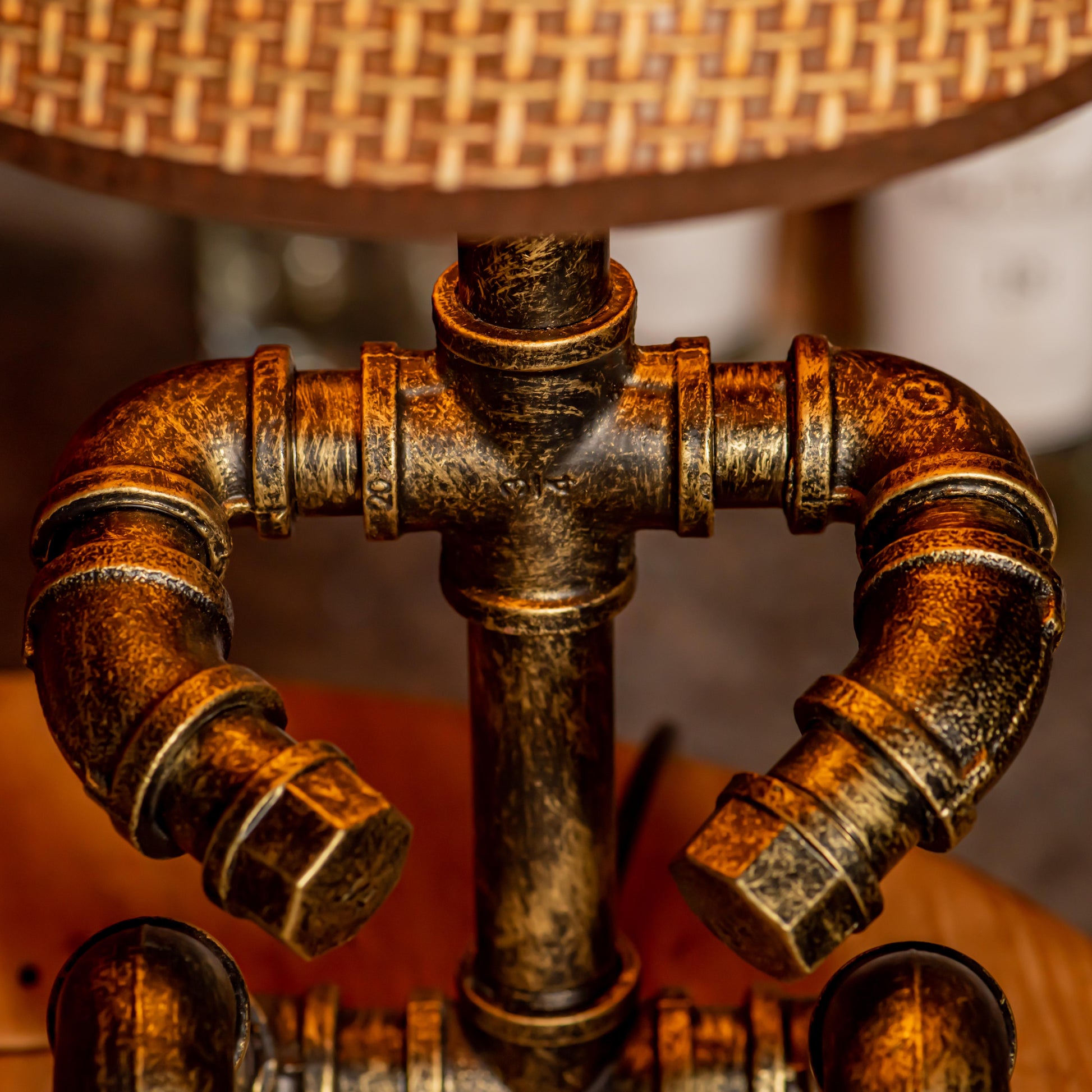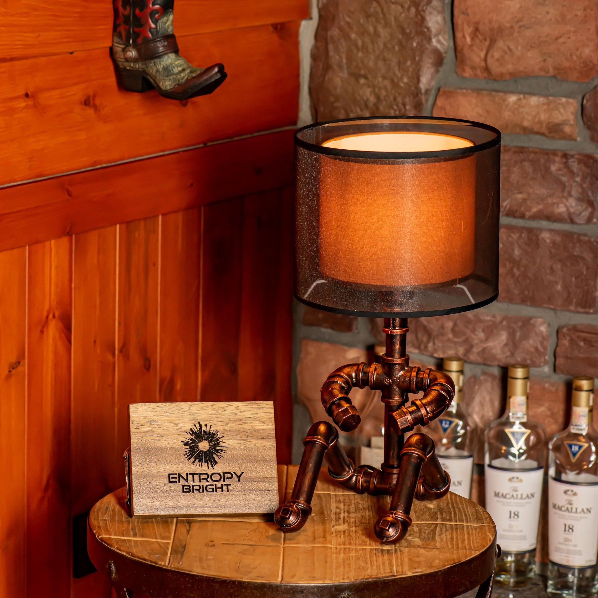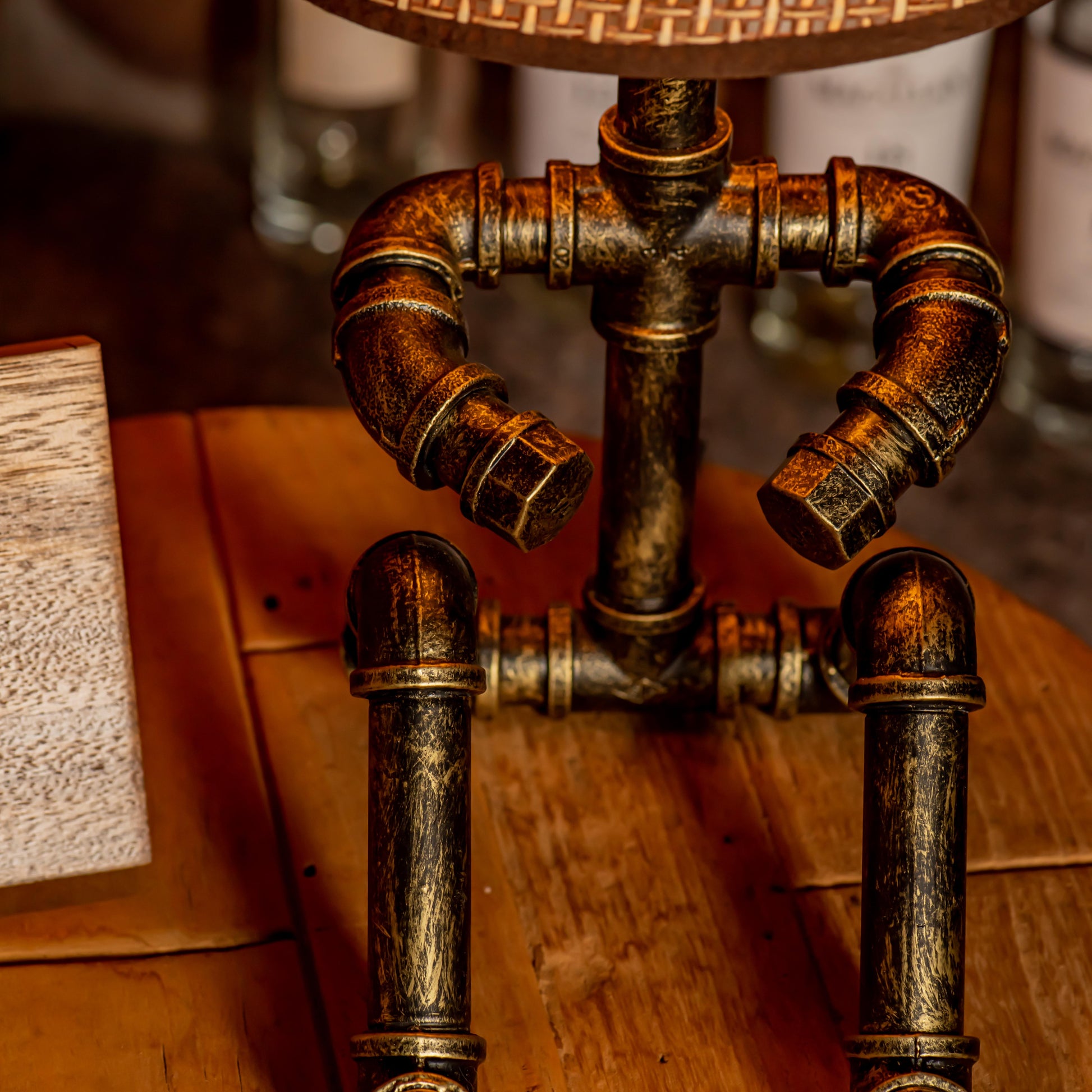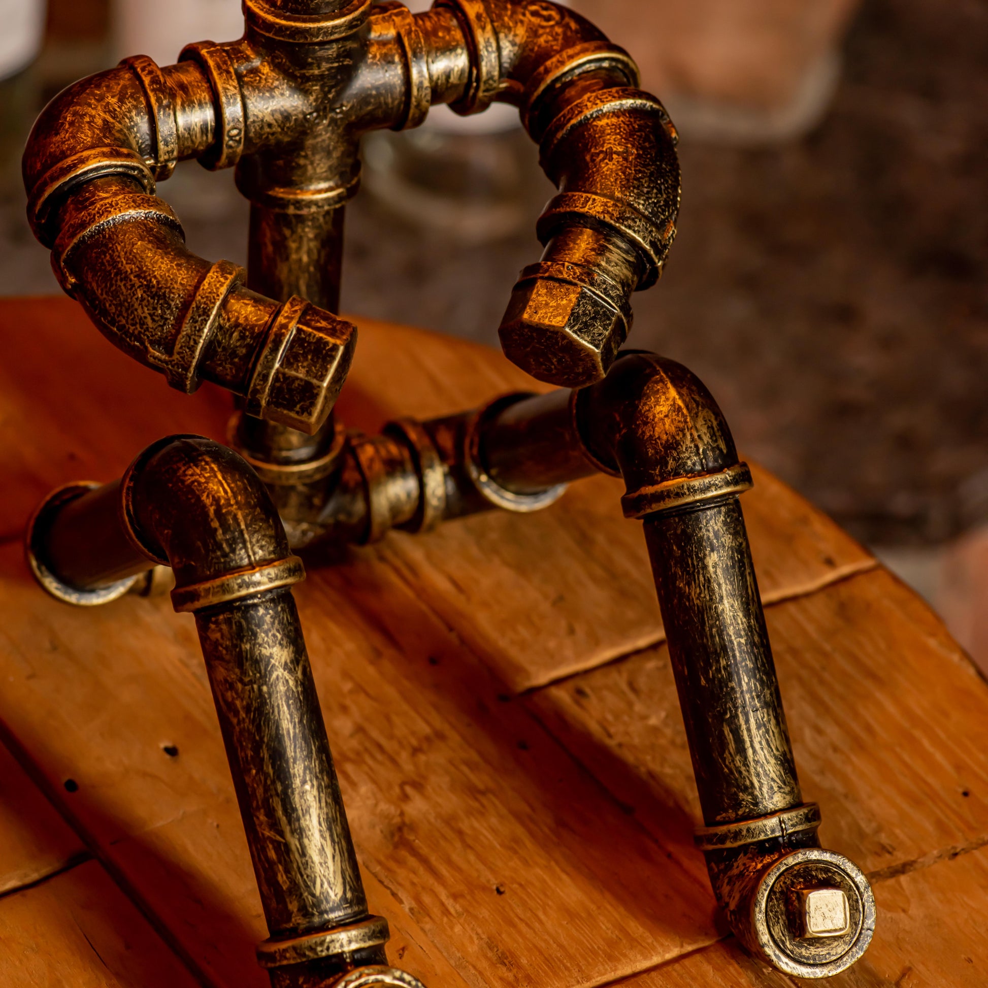 Constructed from 1/2" malleable cast iron pipes, this robot-style table lamp captures the essence of steampunk design. Its exposed hardware and antique finish lend it a rugged charm, ideal for adding personality to eclectic or industrial-themed spaces.
