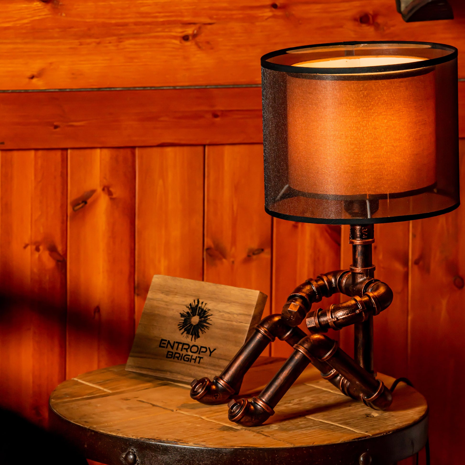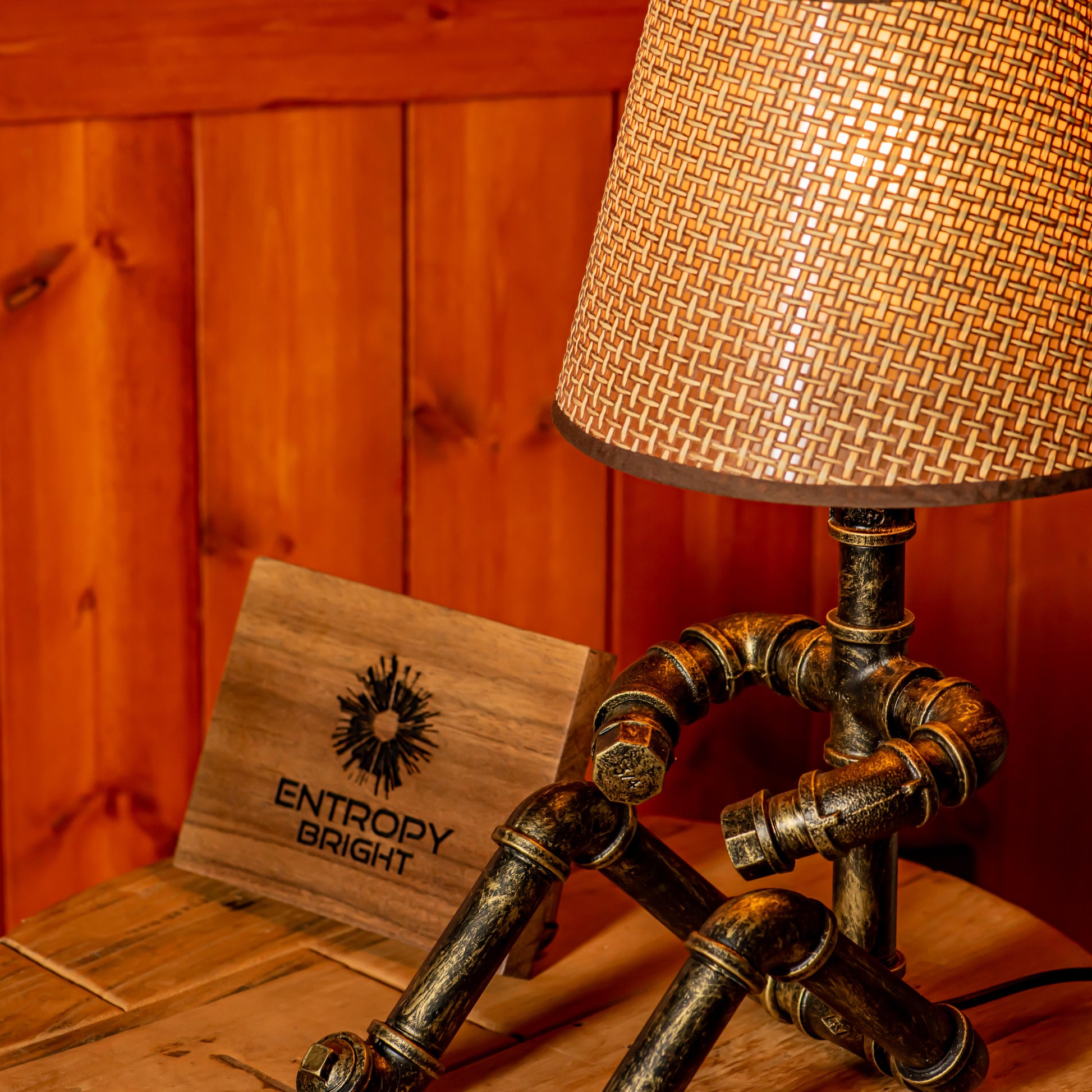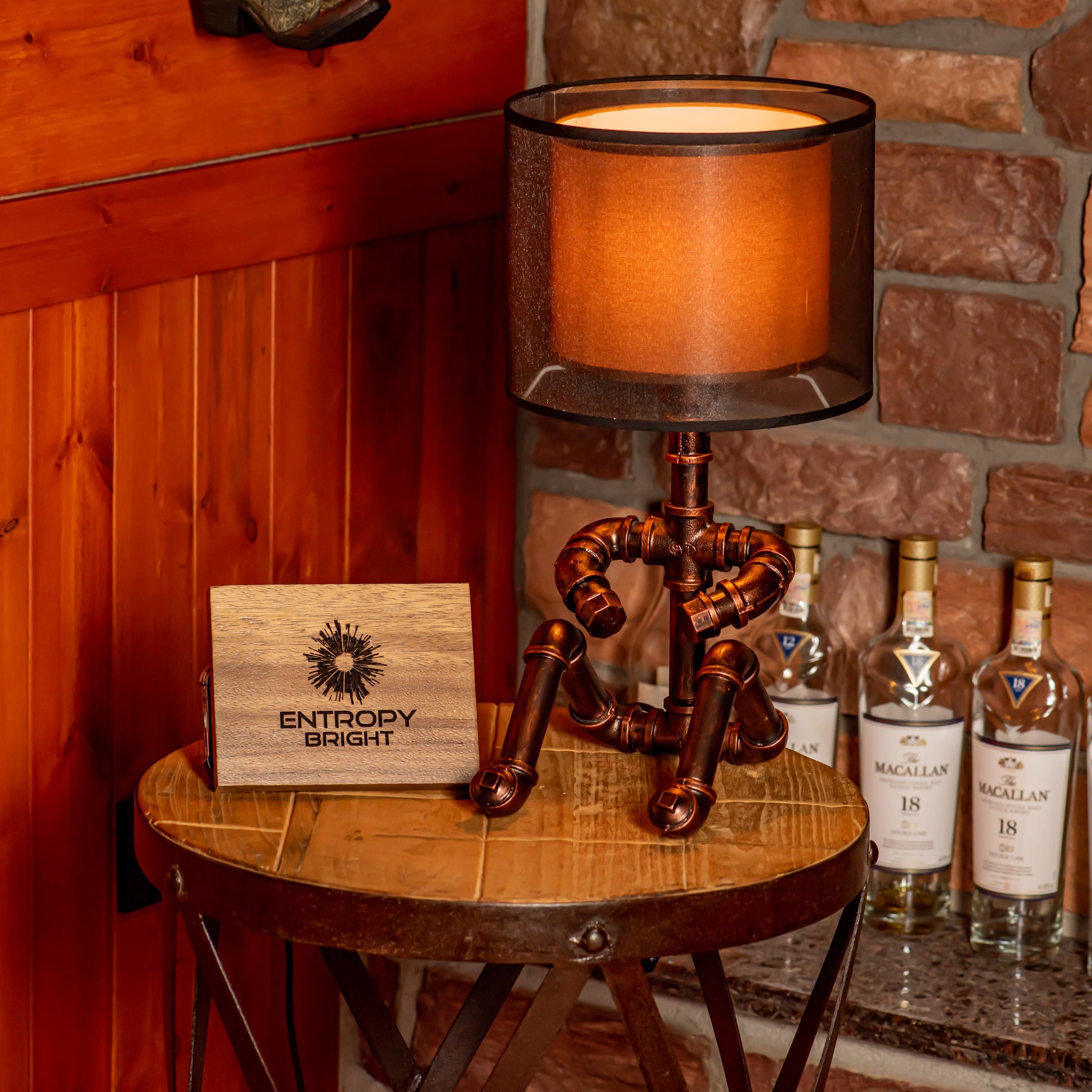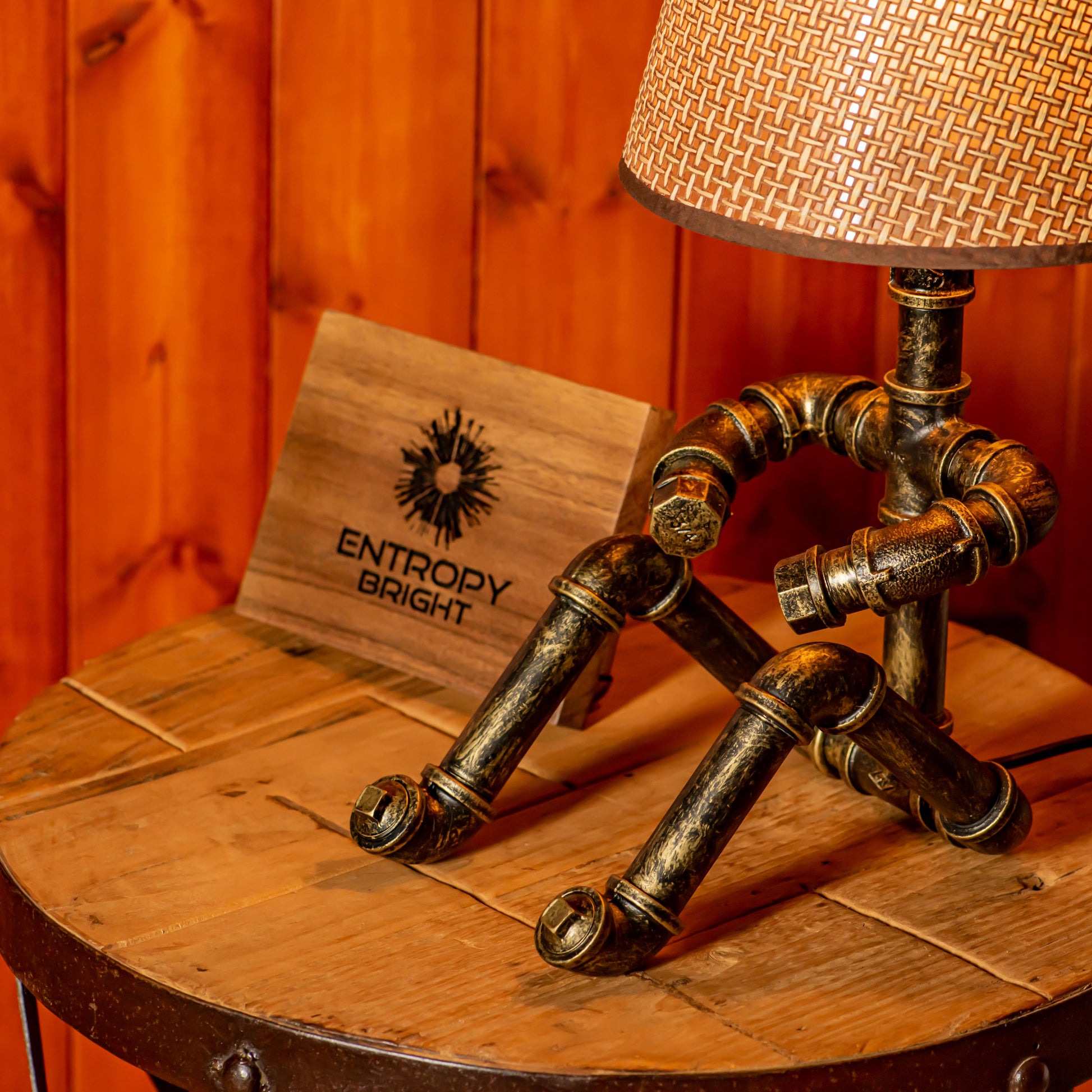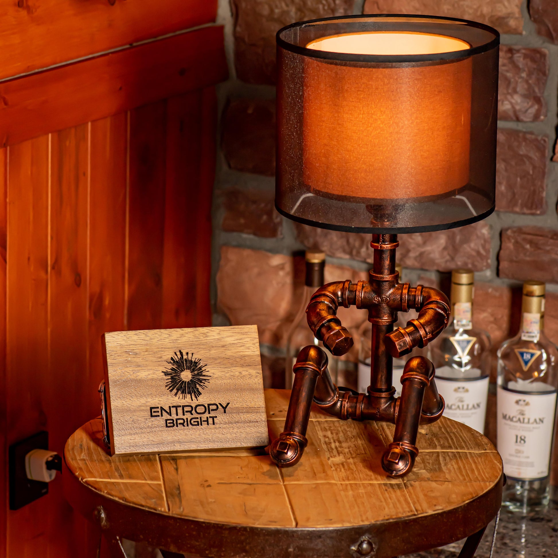 Constructed from 1/2" malleable cast iron pipes, this robot-style table lamp captures the essence of steampunk design. Its exposed hardware and antique finish lend it a rugged charm, ideal for adding personality to eclectic or industrial-themed spaces.