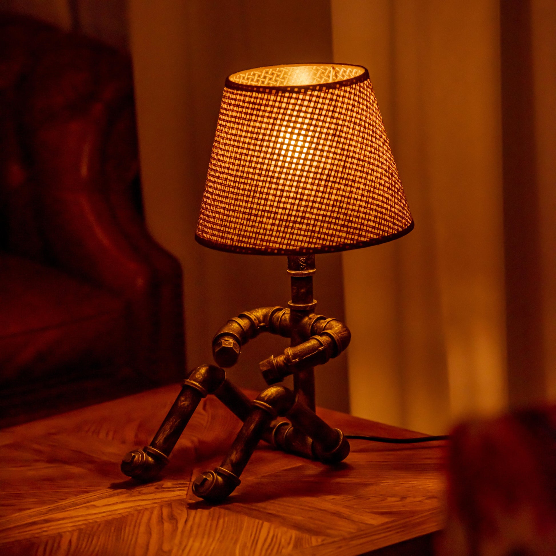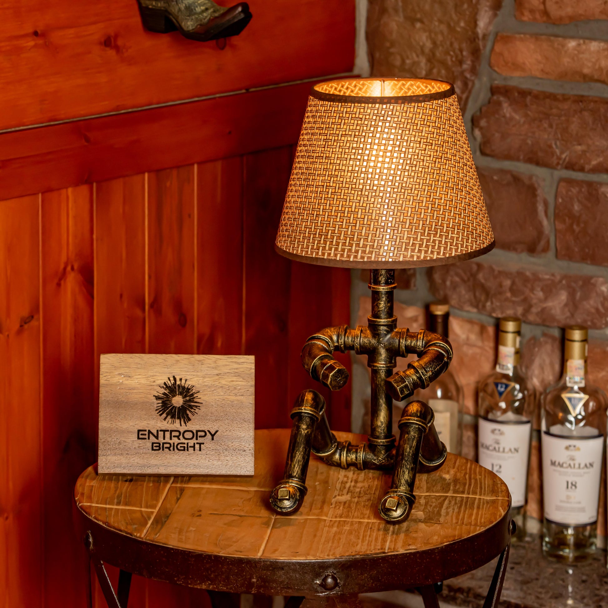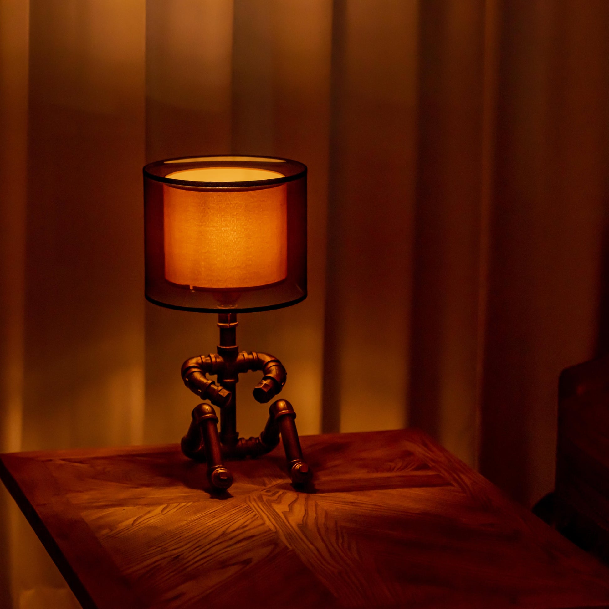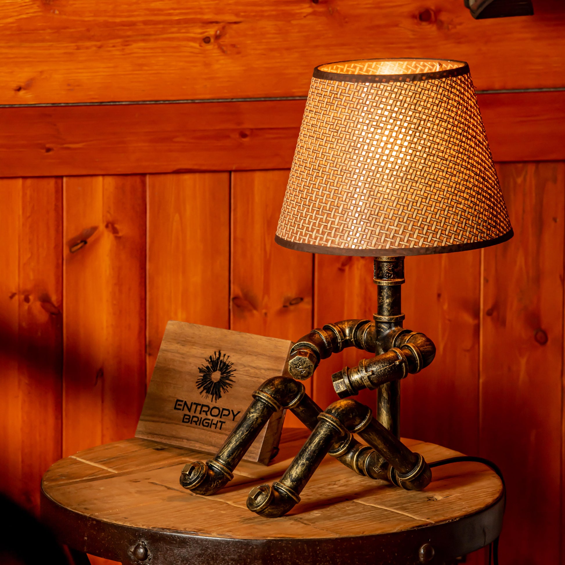 Constructed from 1/2" malleable cast iron pipes, this robot-style table lamp captures the essence of steampunk design. Its exposed hardware and antique finish lend it a rugged charm, ideal for adding personality to eclectic or industrial-themed spaces.