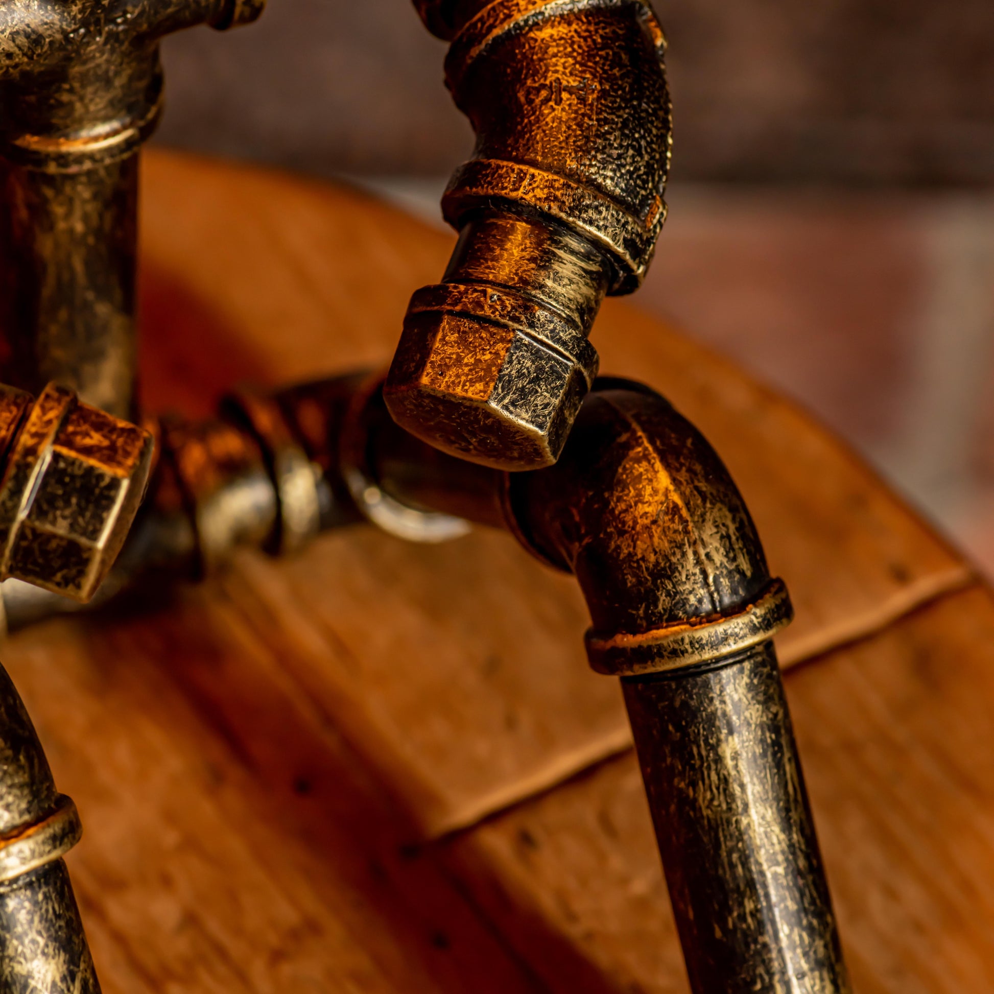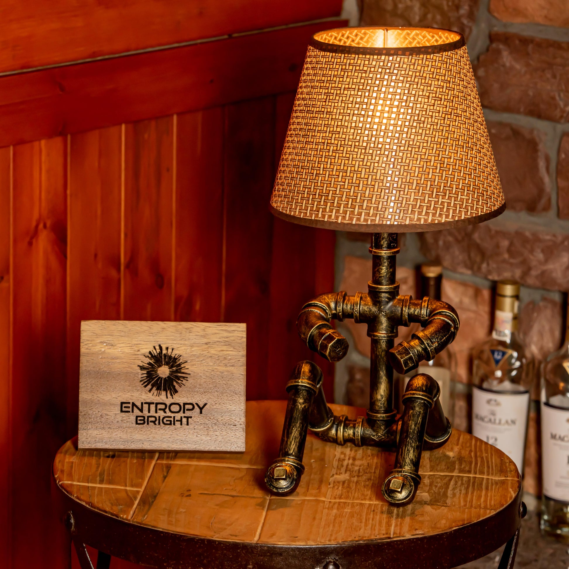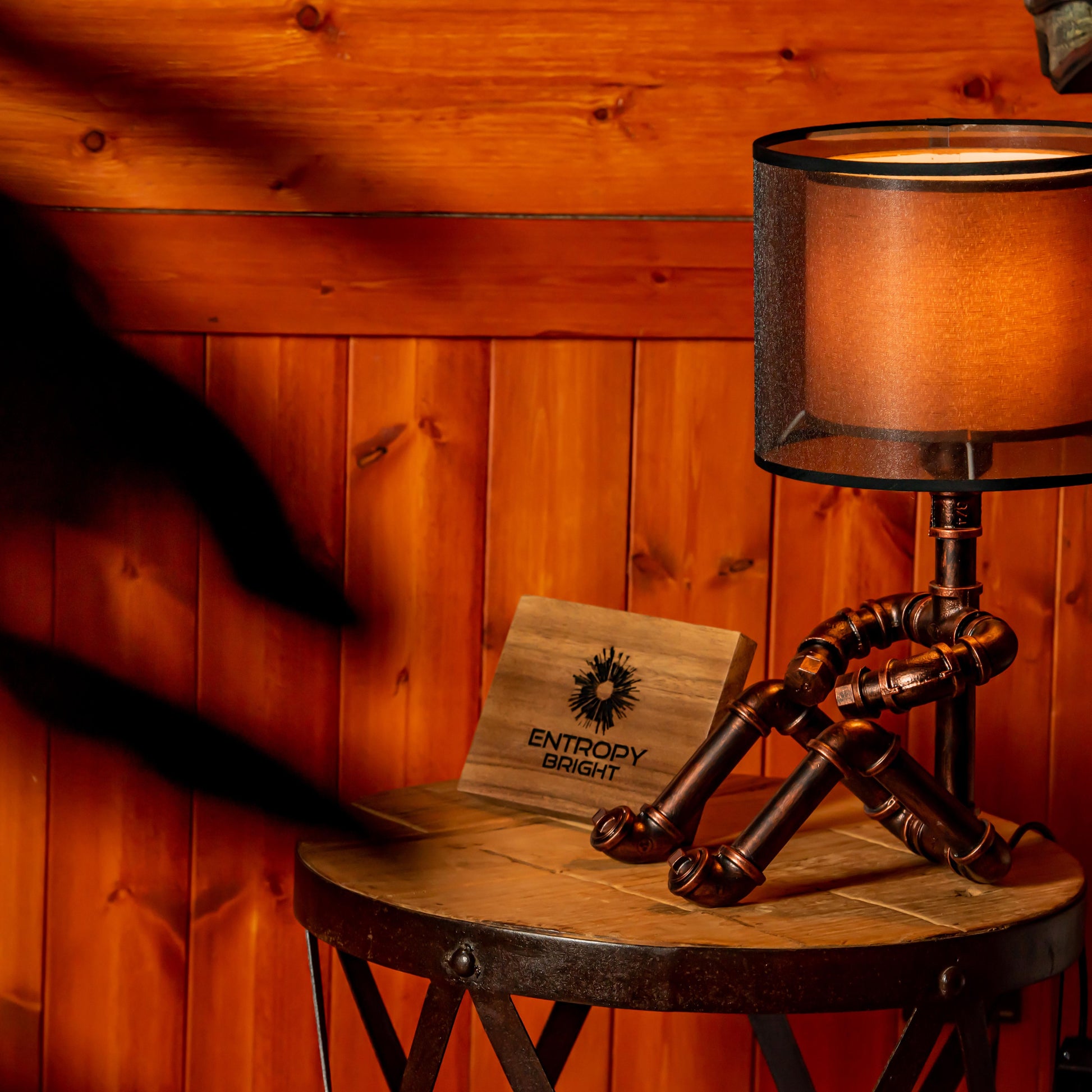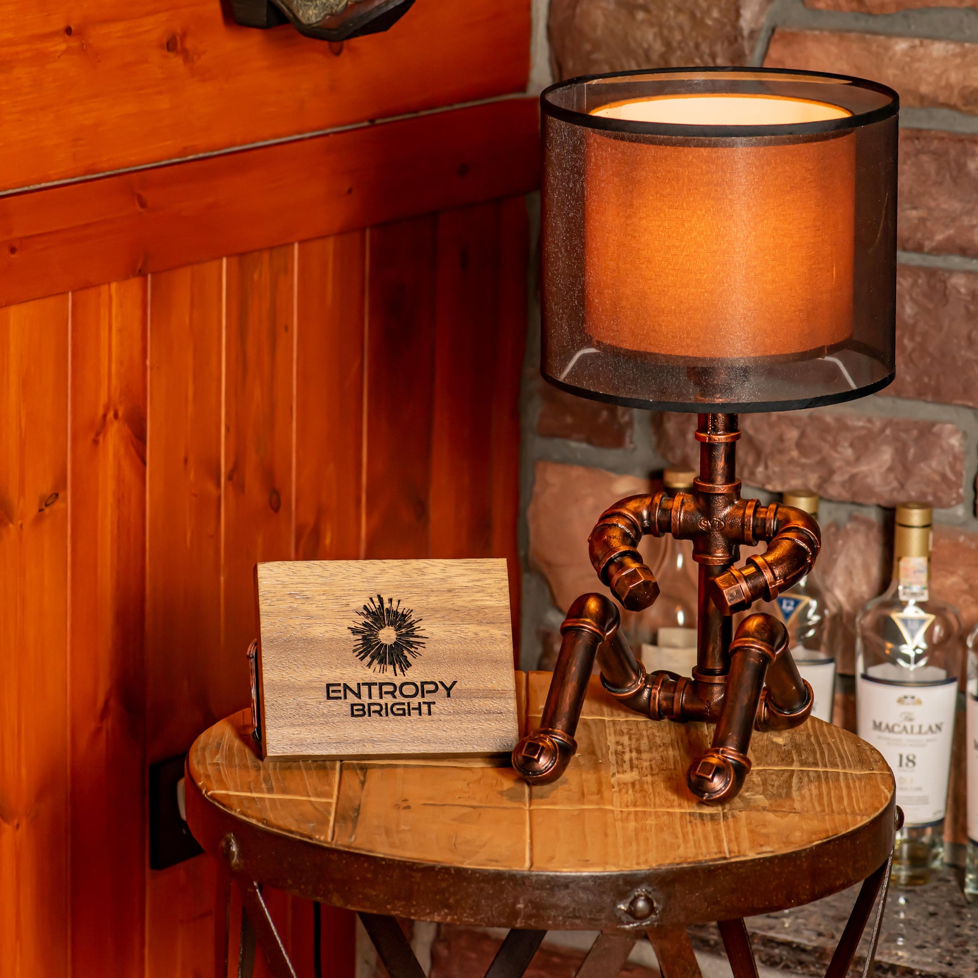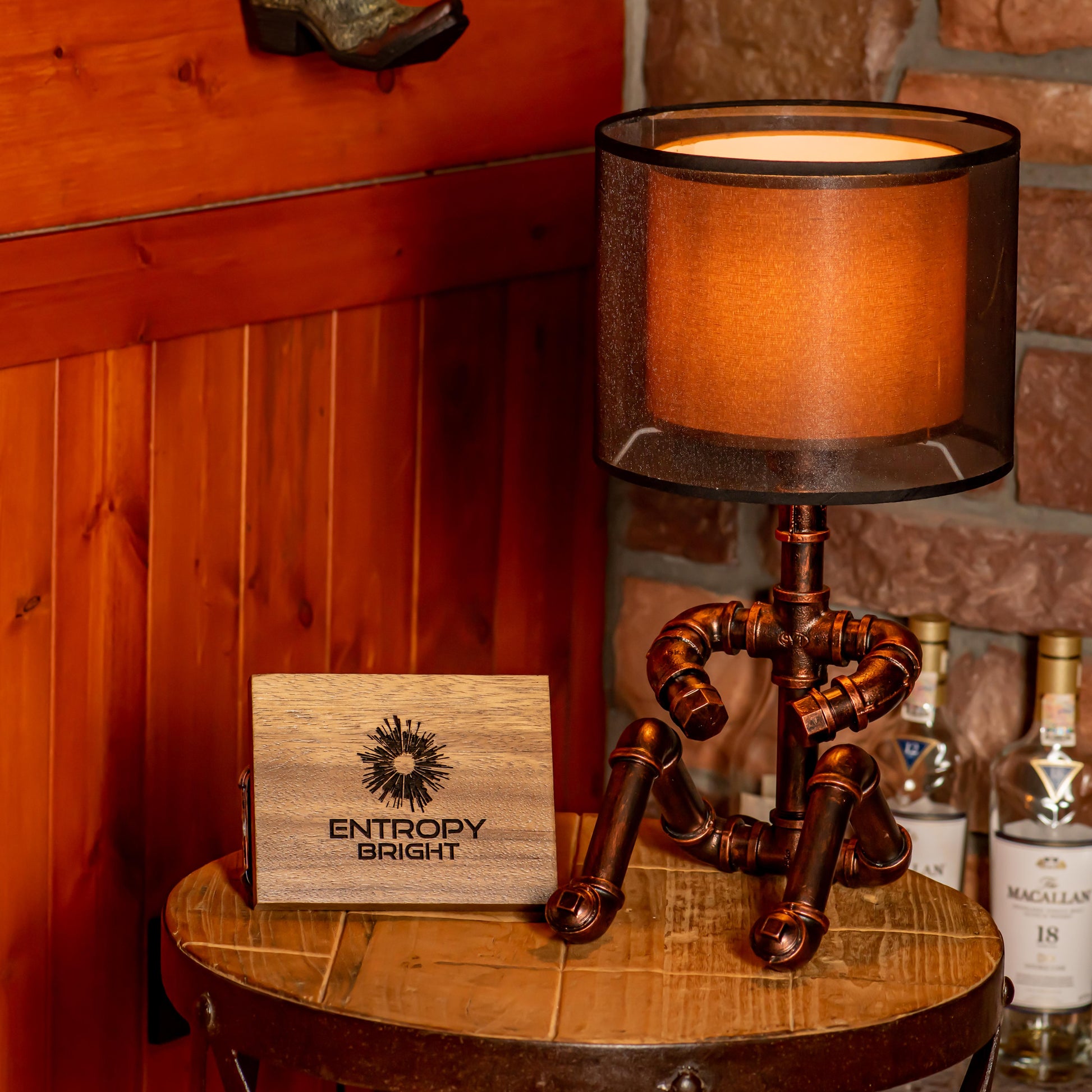 Constructed from 1/2" malleable cast iron pipes, this robot-style table lamp captures the essence of steampunk design. Its exposed hardware and antique finish lend it a rugged charm, ideal for adding personality to eclectic or industrial-themed spaces.
