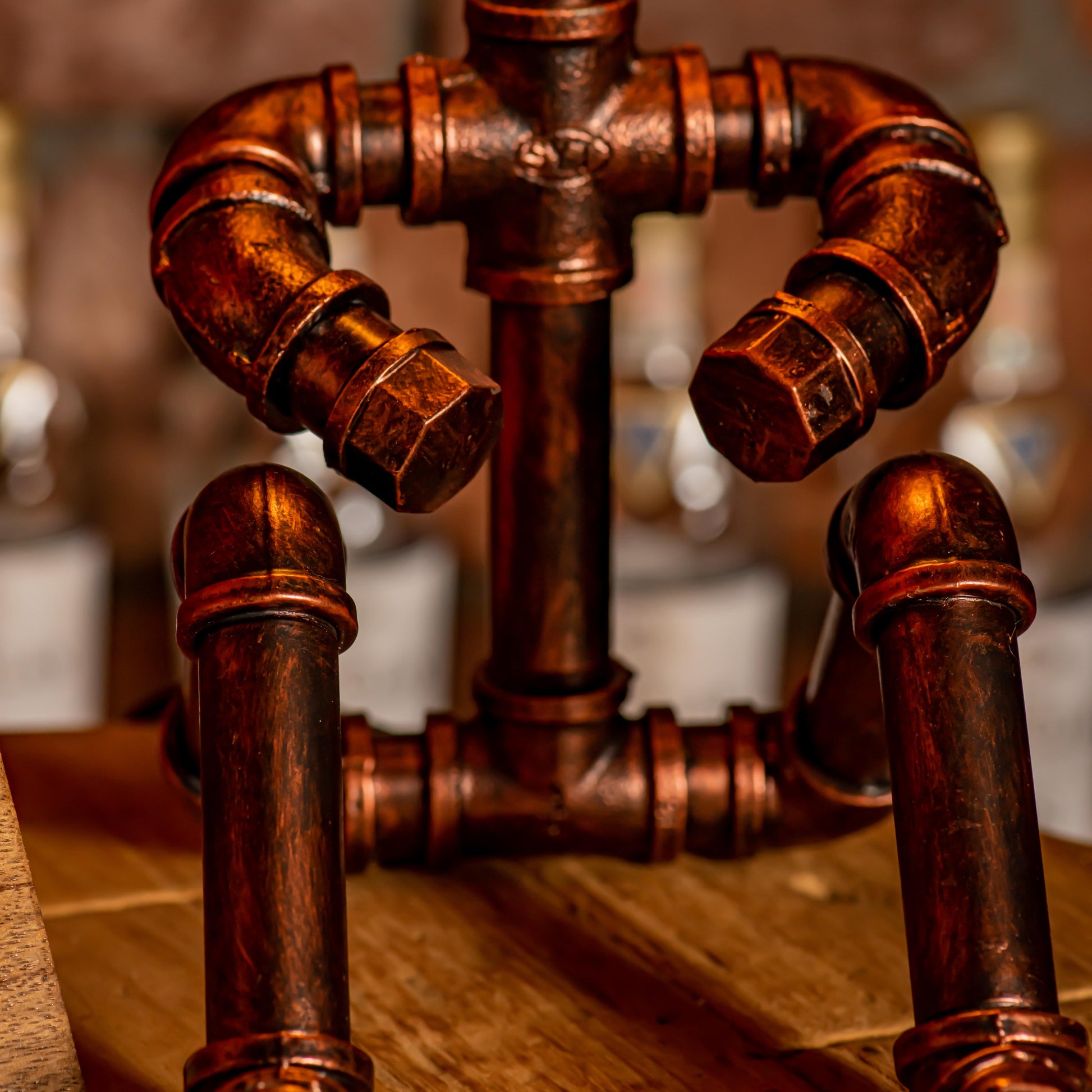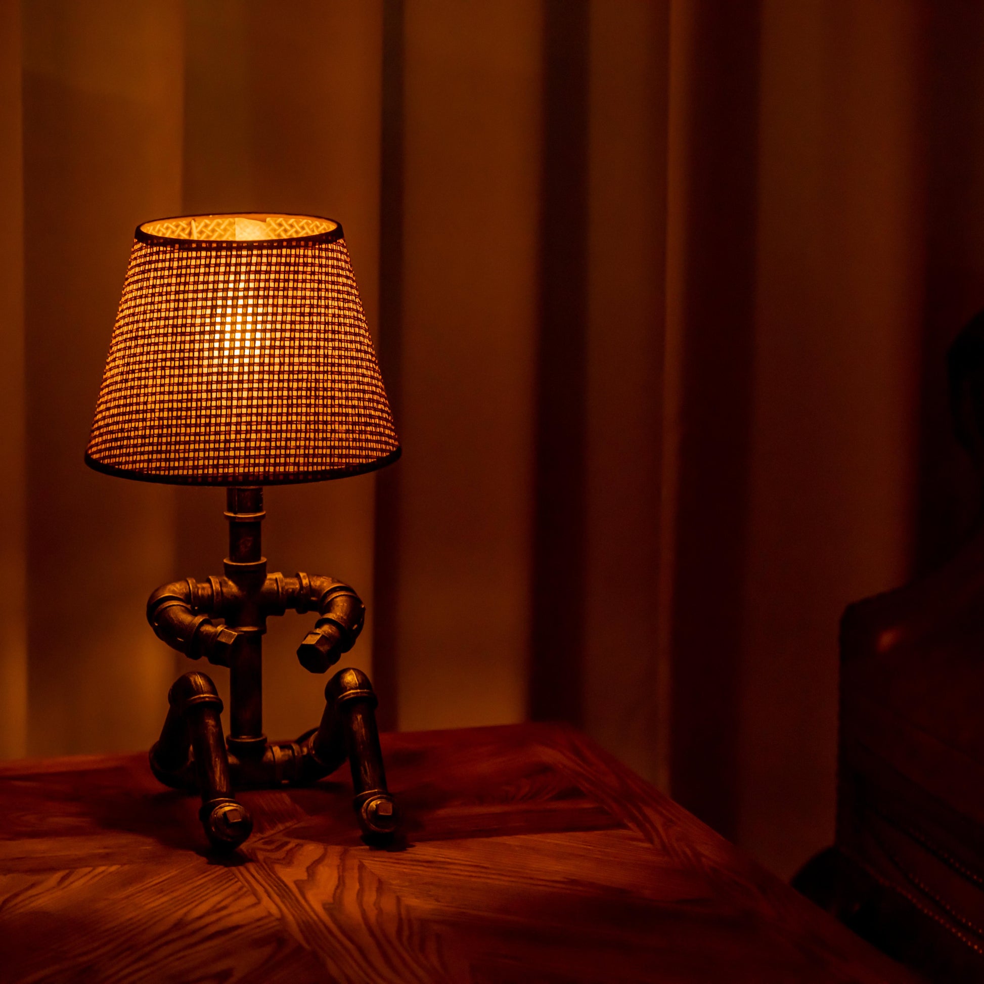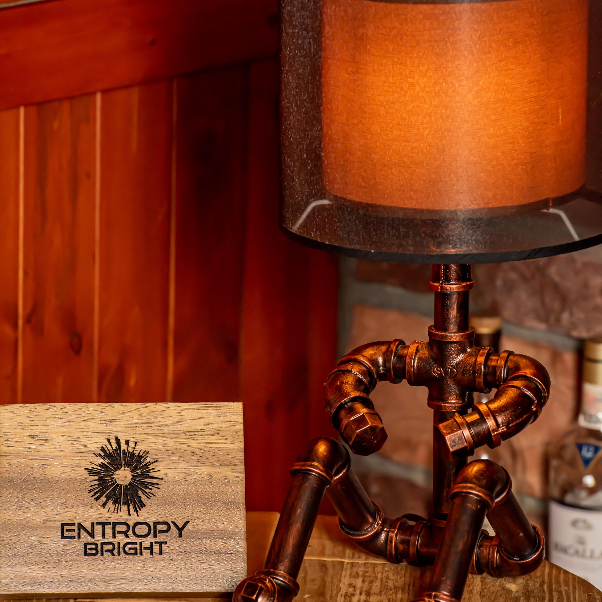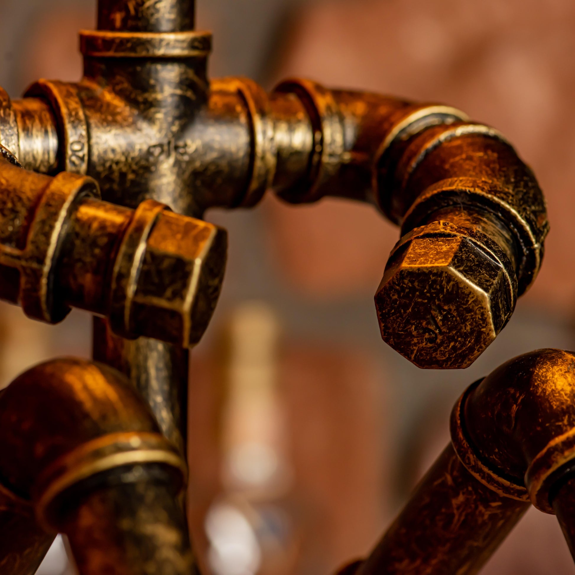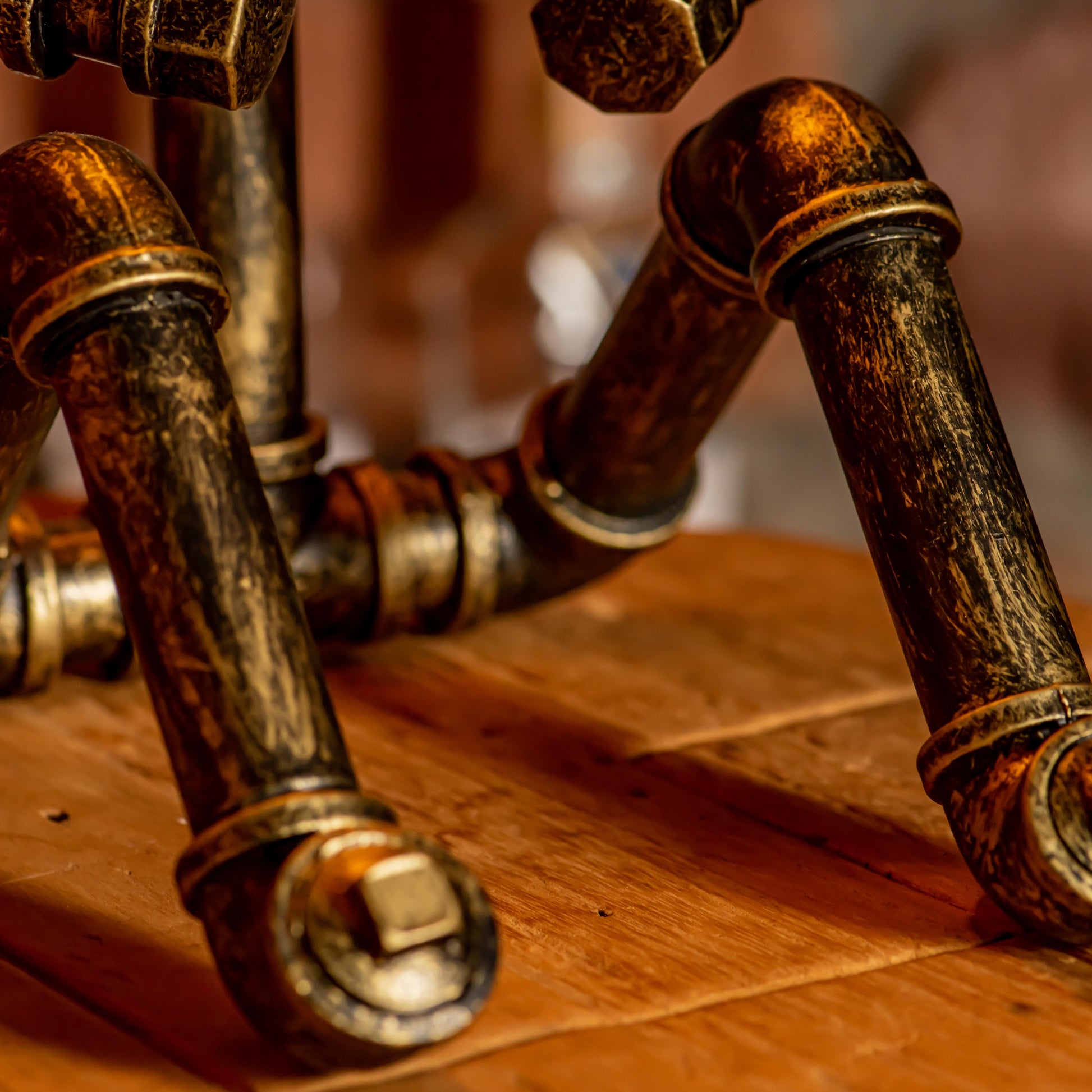 Constructed from 1/2" malleable cast iron pipes, this robot-style table lamp captures the essence of steampunk design. Its exposed hardware and antique finish lend it a rugged charm, ideal for adding personality to eclectic or industrial-themed spaces.