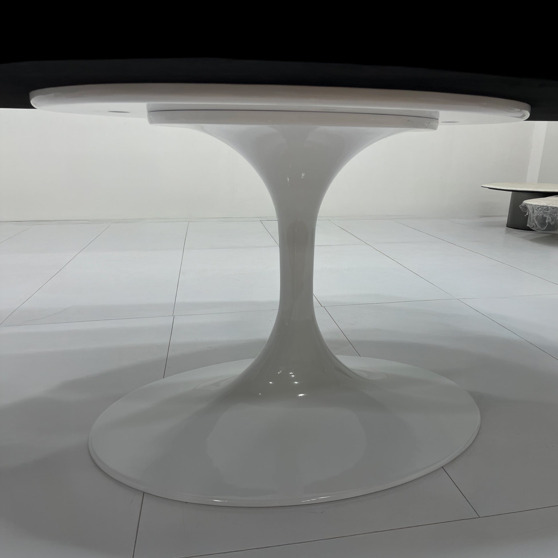 The MDF tabletop with a high-quality marble finish offers a smooth, easy-to-clean surface, while the powder-coated metal pedestal base ensures stability and durability. A non-marking ring protects floors, making it ideal for everyday use.