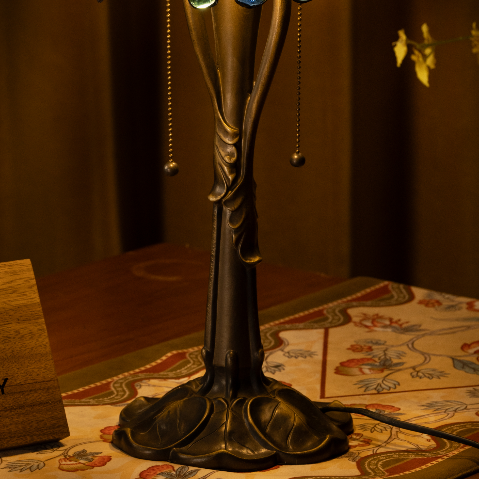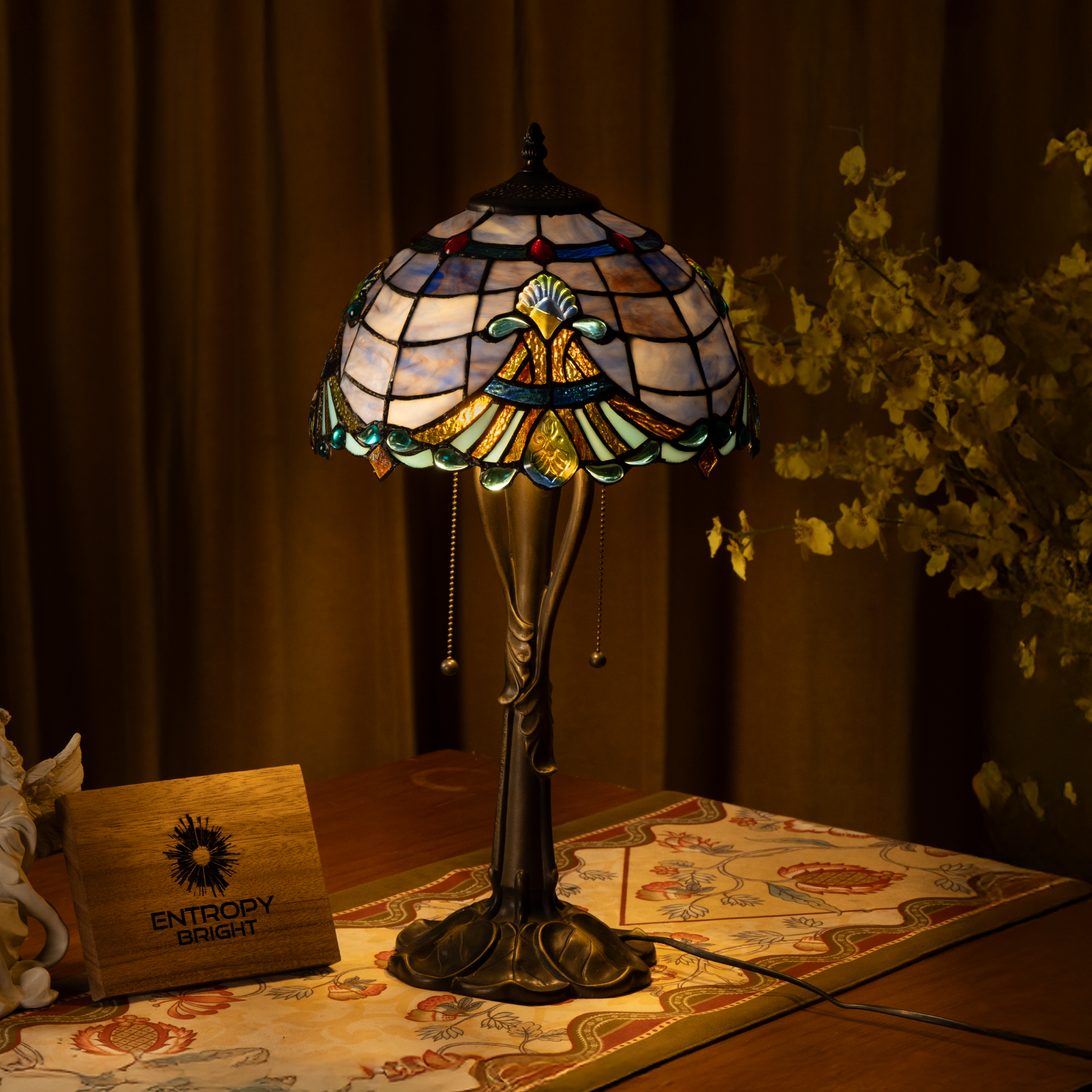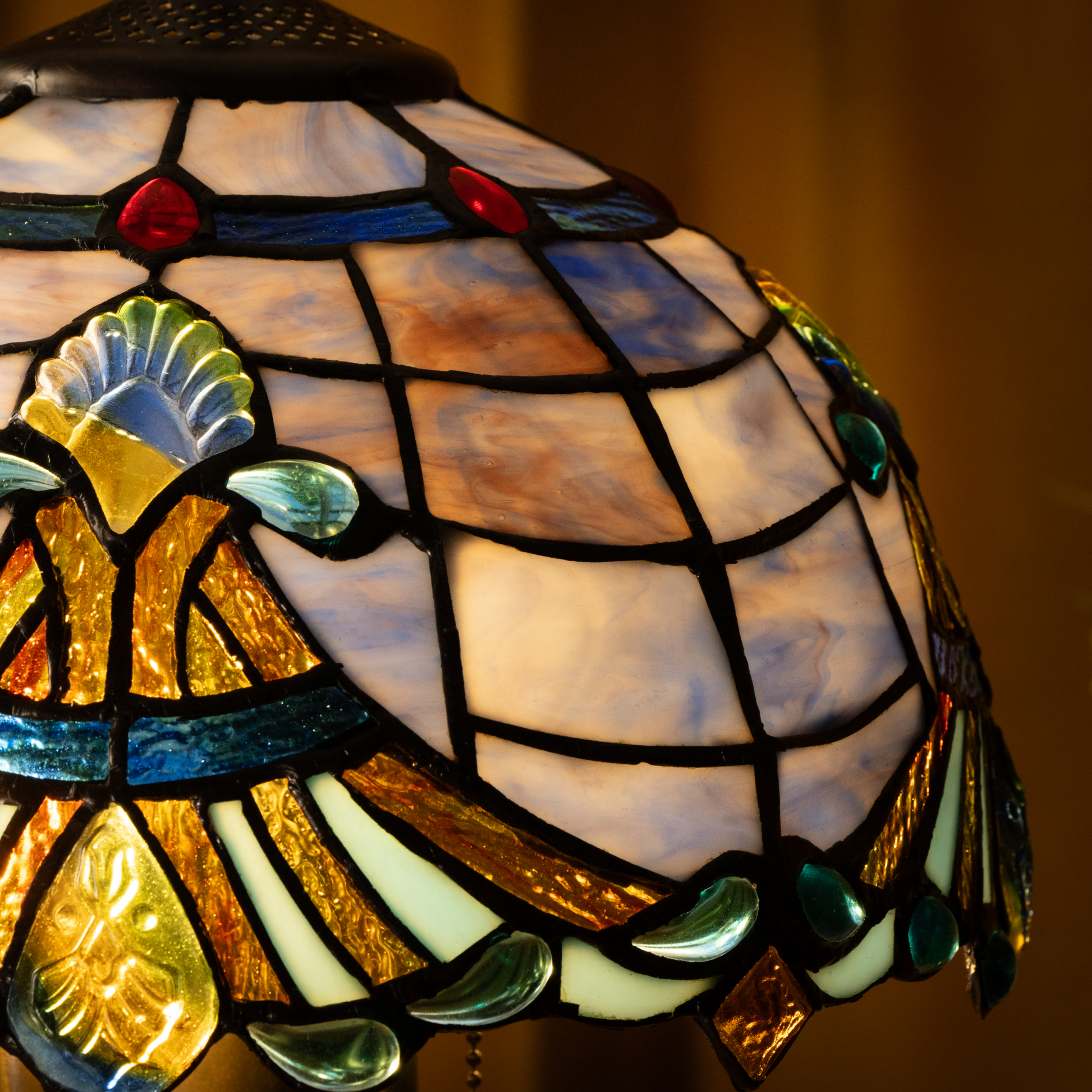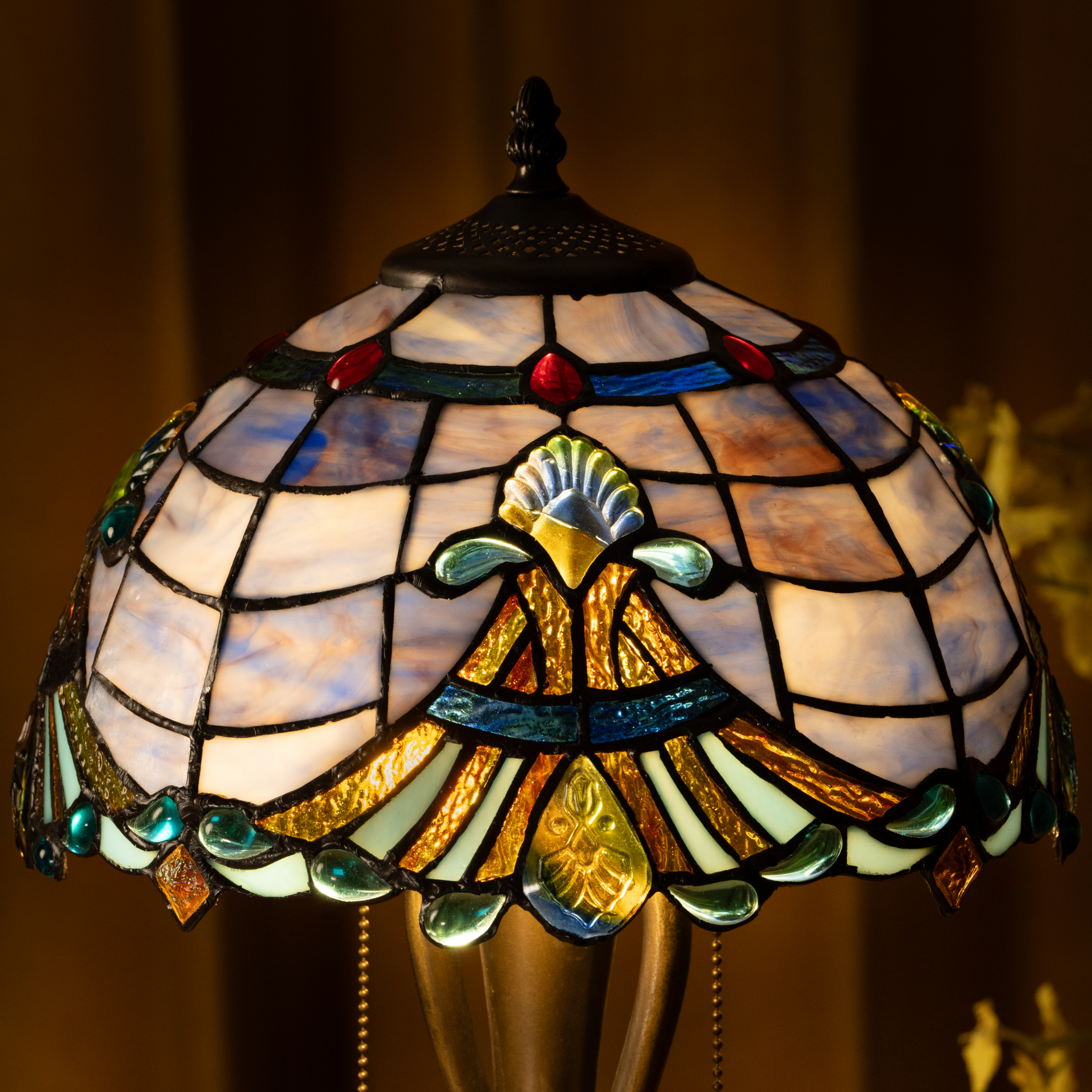 Shade Material: Handcrafted Stained Glass with Jewel Accents