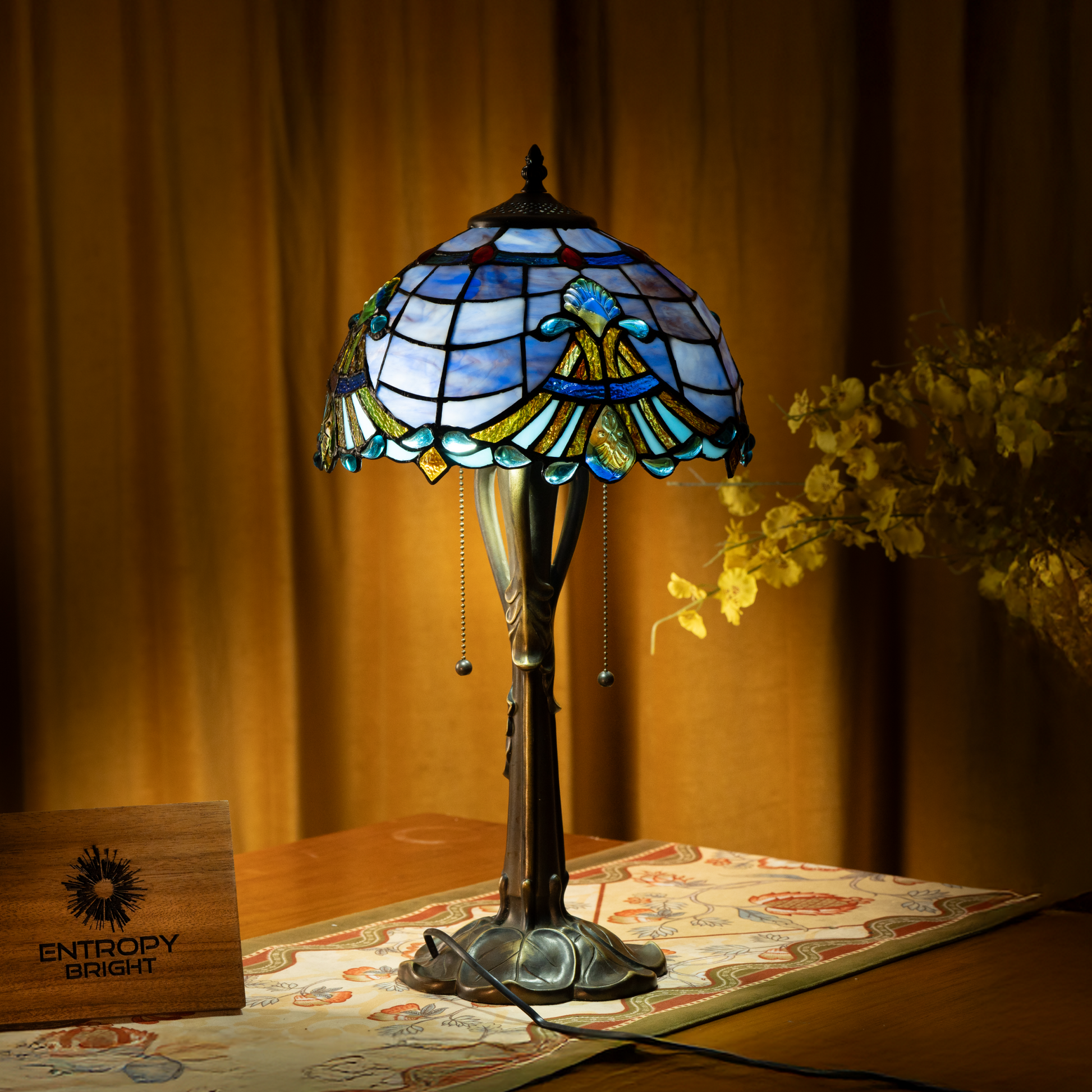 The stained glass shade combines soft blues, golds, and greens in graceful waves, enhanced by jewel-like highlights that shimmer subtly. The design captures the tranquil movement of water and brings a sense of calm to the room.