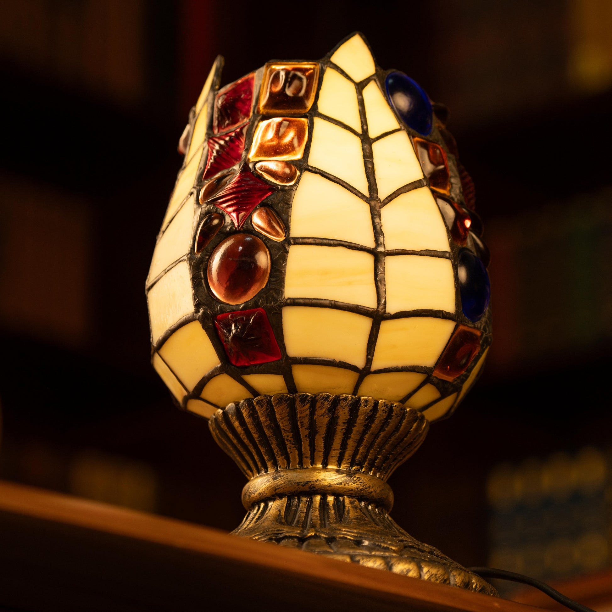 The Nocturne Crest Lamp channels gothic revival into a compact form, with its tulip-bud silhouette and vertical crest motif offering an air of quiet intensity. The stained-glass mosaic—layering sapphire, bronze, and alabaster—creates a rich interplay of color and depth.
