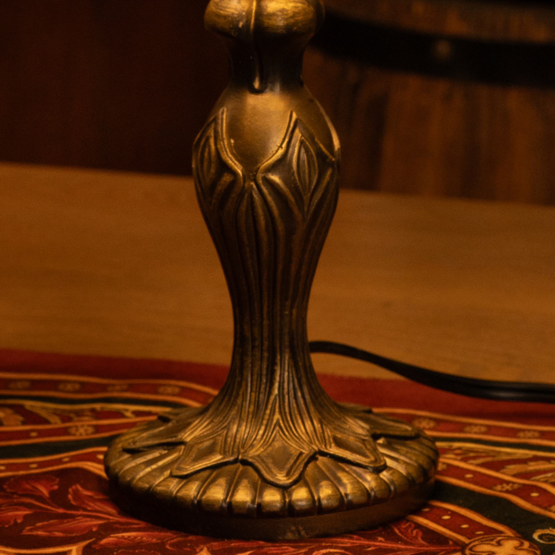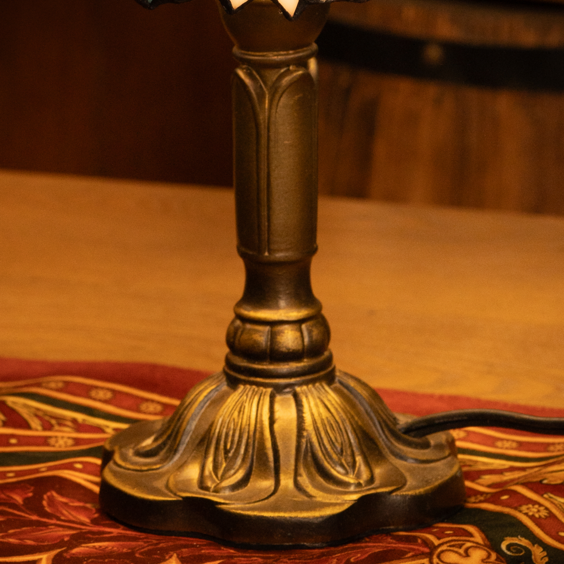 Material: Handcrafted Stained Glass Shade, Metal Base with Antique Bronze Finish