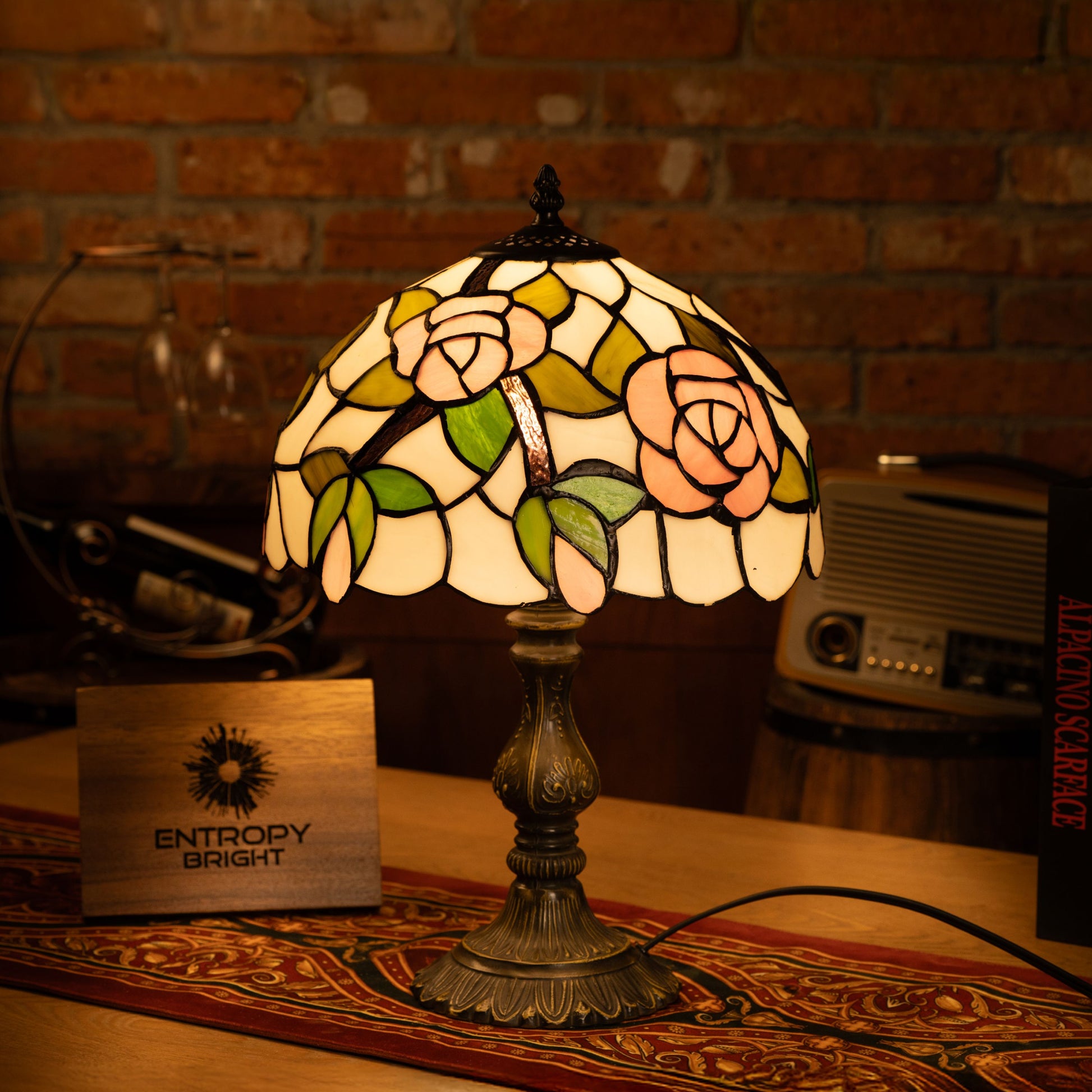 The shade showcases a garden of roses in soft pink, crimson red, and leafy green, each piece of glass delicately set by hand. The warm light that filters through creates a serene and romantic ambiance, perfect for cozy interiors.