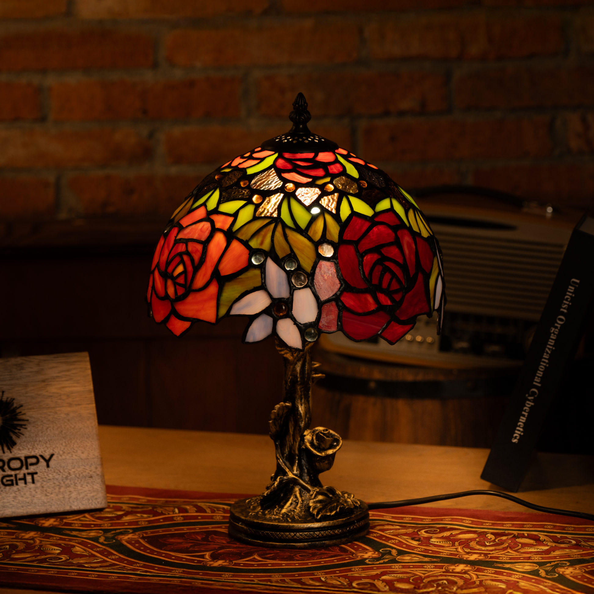 Material: Handcrafted Stained Glass Shade, Metal Base with Antique Bronze Finish