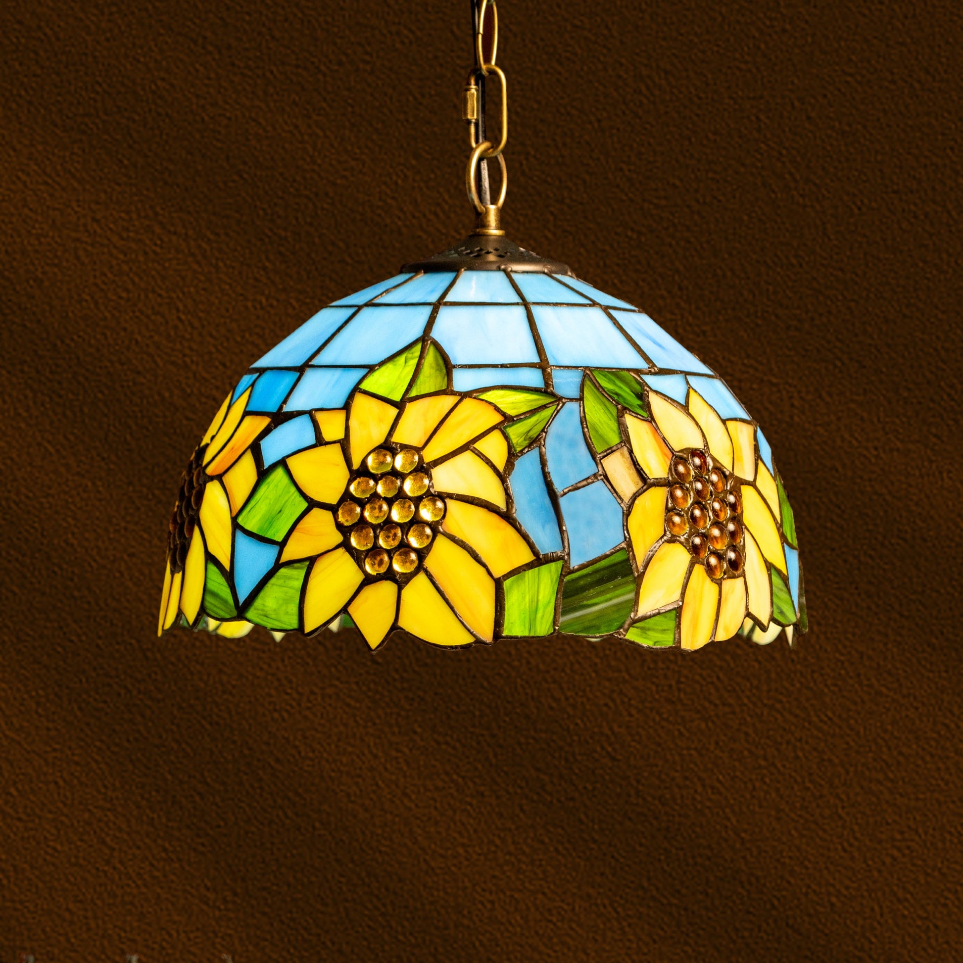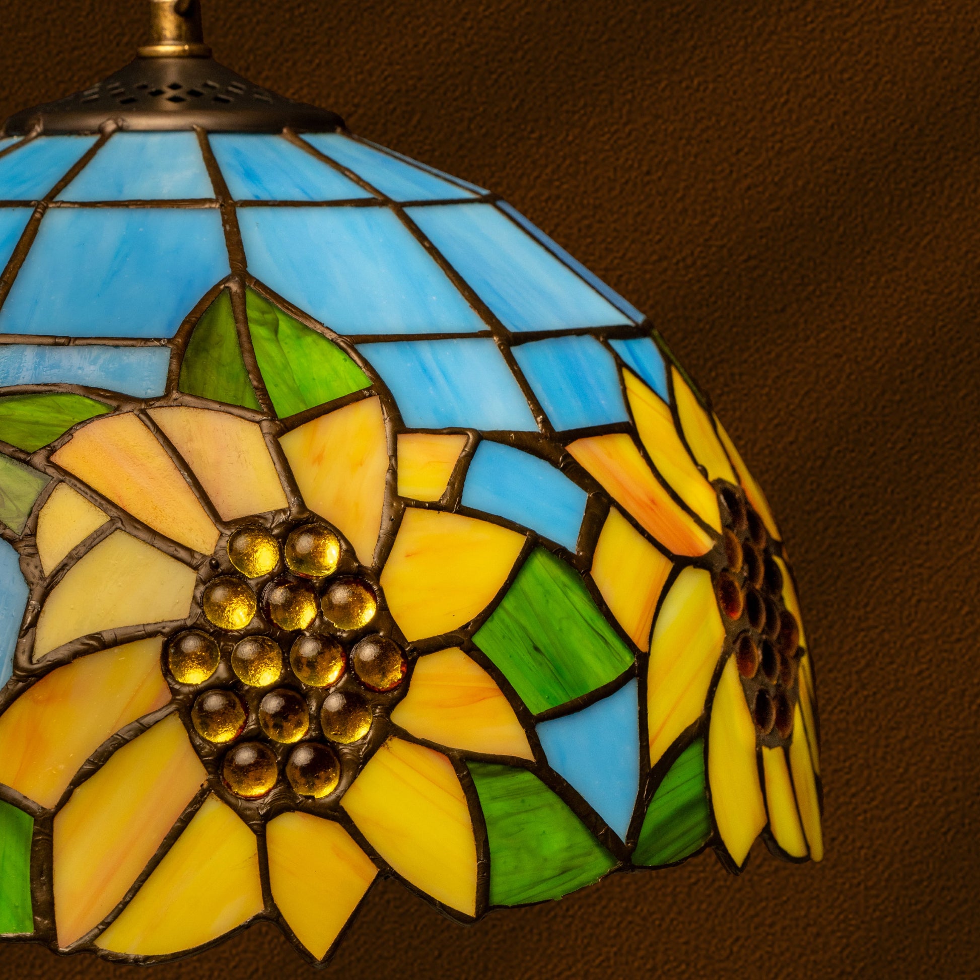 The Sunflower Bliss Tiffany Pendant celebrates the joy of nature with a handcrafted stained glass design in golden yellows, leafy greens, and calming blues. Its sunflower motif radiates warmth and positivity, making it a natural fit for welcoming interiors.