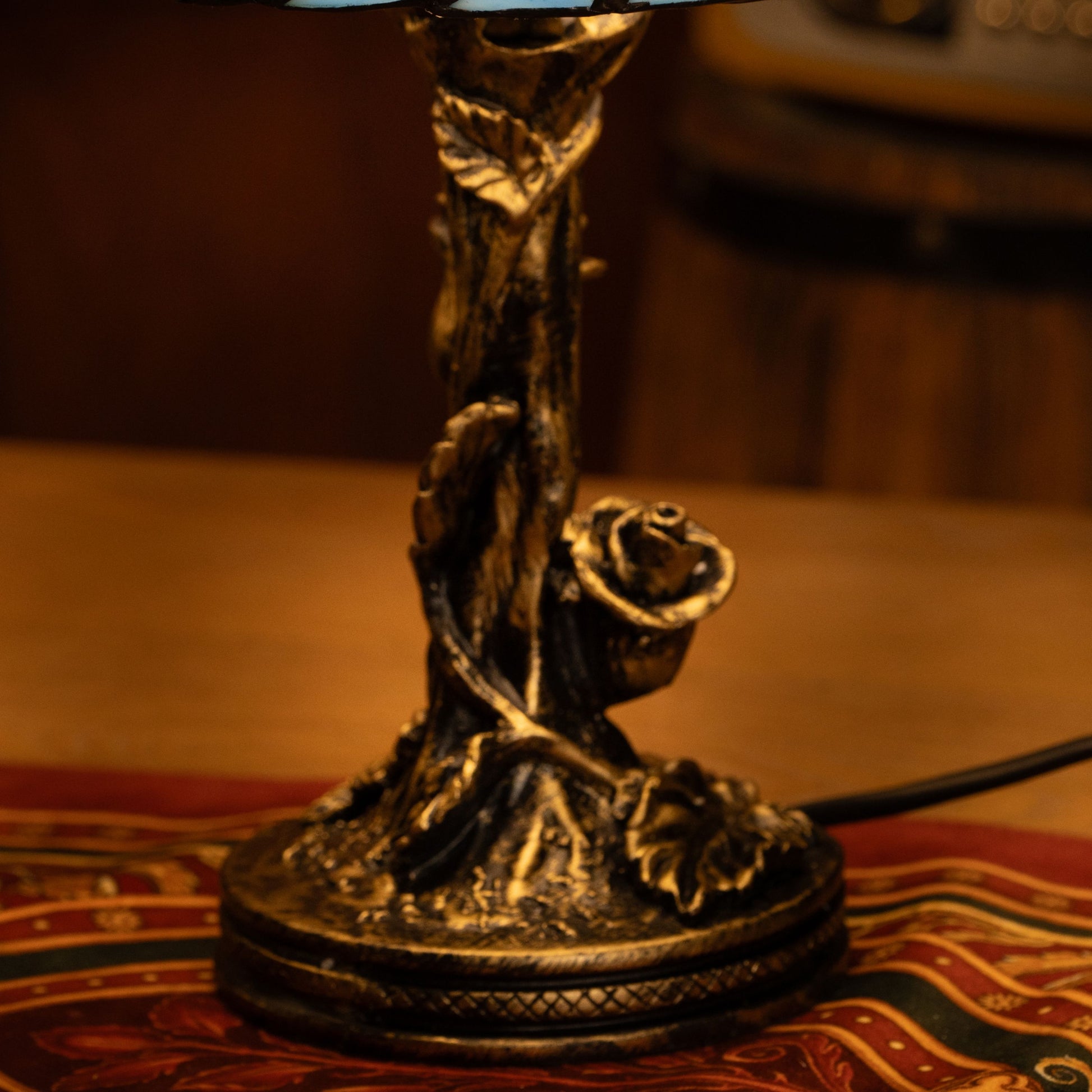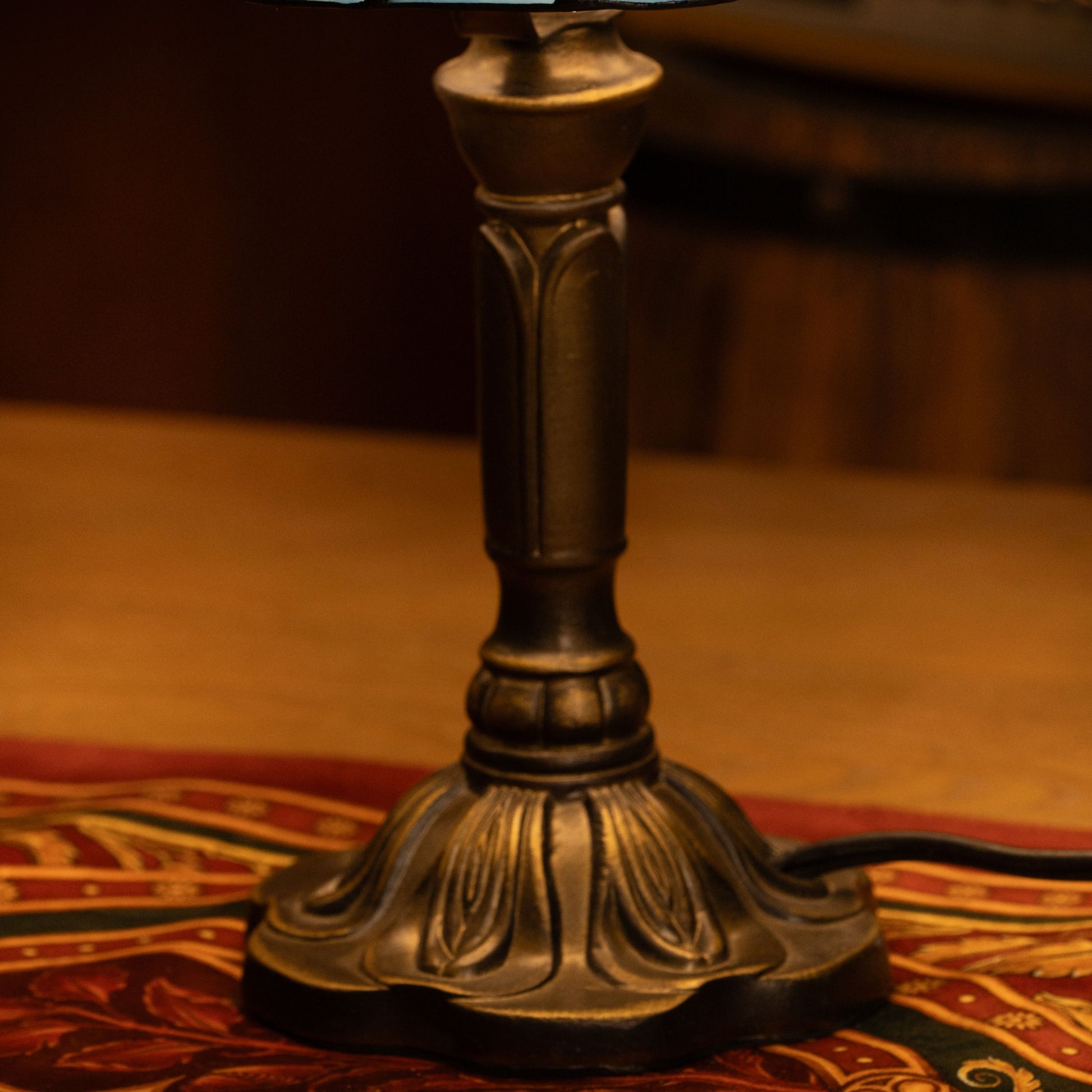 Material: Handcrafted Stained Glass Shade, Metal Base with Antique Bronze Finish